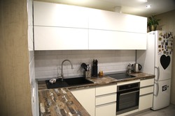 Классическая линейная кухня оборудована глянцевыми белыми фасадами, которые создают в помещении очень светлую и уютную обстановку. Стиля добавляет скрытая фурнитура, которая обеспечивает доступ к содержимому шкафчиков с помощью легкого нажатия на створку. Большая вместительность позволяет расположить всю необходимую посуду.