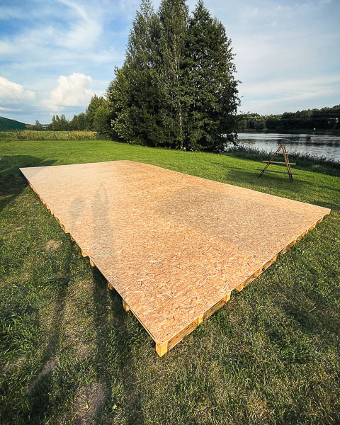 Деревянный пол для шатров — это наиболее простой и быстрый способ создать ровную поверхность под шатром. В его основе лежат паллеты либо брус, на которые укладываются OSB-листы. Такой пол подходит для относительно ровных оснований и идеально подходит для организации танцевальных площадок, выставочных зон или обеденных пространств на свежем воздухе. Кроме того, он легко разбирается и переносится, что делает его отличным вариантом для временных мероприятий.