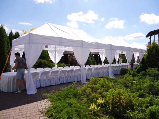 Конструкция является универсальной, а навесные стенки расположены таким образом, чтобы можно было снять их или заменить, либо совместить вместе несколько шатров в ряд для увеличения полезной площади помещения, чтобы проводить в них мероприятия любого рода. Так, вы сформируете удобную рассадку приглашенных гостей и компоновку мебели. Таким образом, в вашем распоряжении будет помещение с уютным интерьером, и ваши гости оценят это по достоинству.