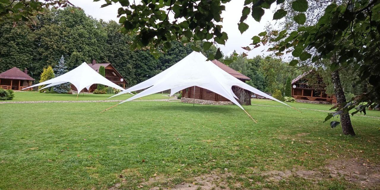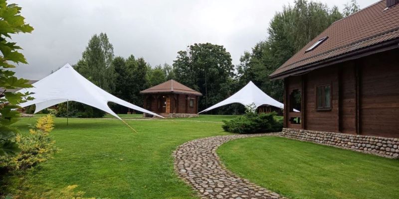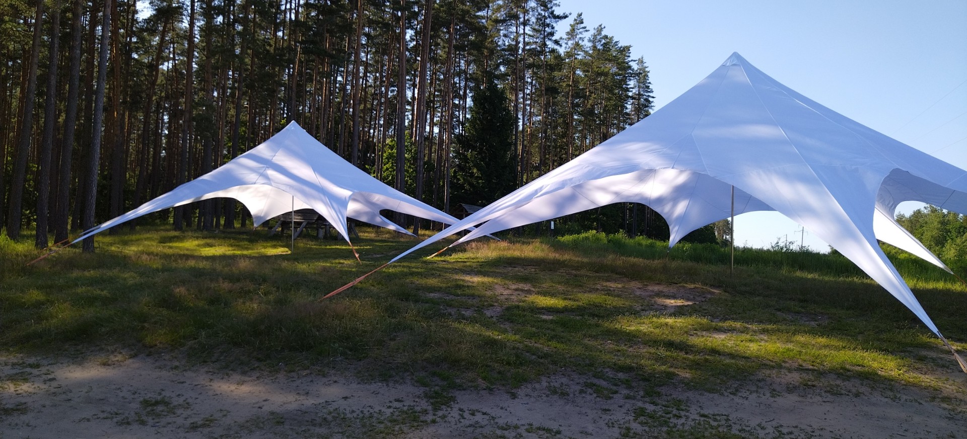 Если Вас интересует аренда шатров, обратите внимание на наш тент-шатер «Звезда» белого цвета цвета. Его стильный дизайн подчеркнет уникальность Вашего мероприятия, а также объединит людей в импровизированном пространстве. Этот просторный шатер вмещает в себя до 60-ти человек и в высоту достигает пяти метров! Он изготовлен из водонепроницаемого тента и точно не позволит гостям промокнуть под внезапным ливнем.