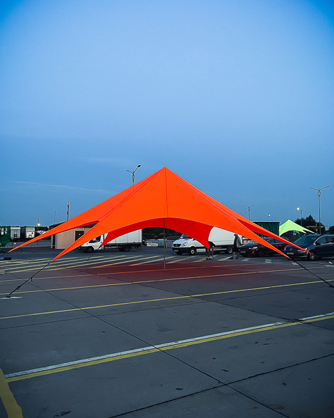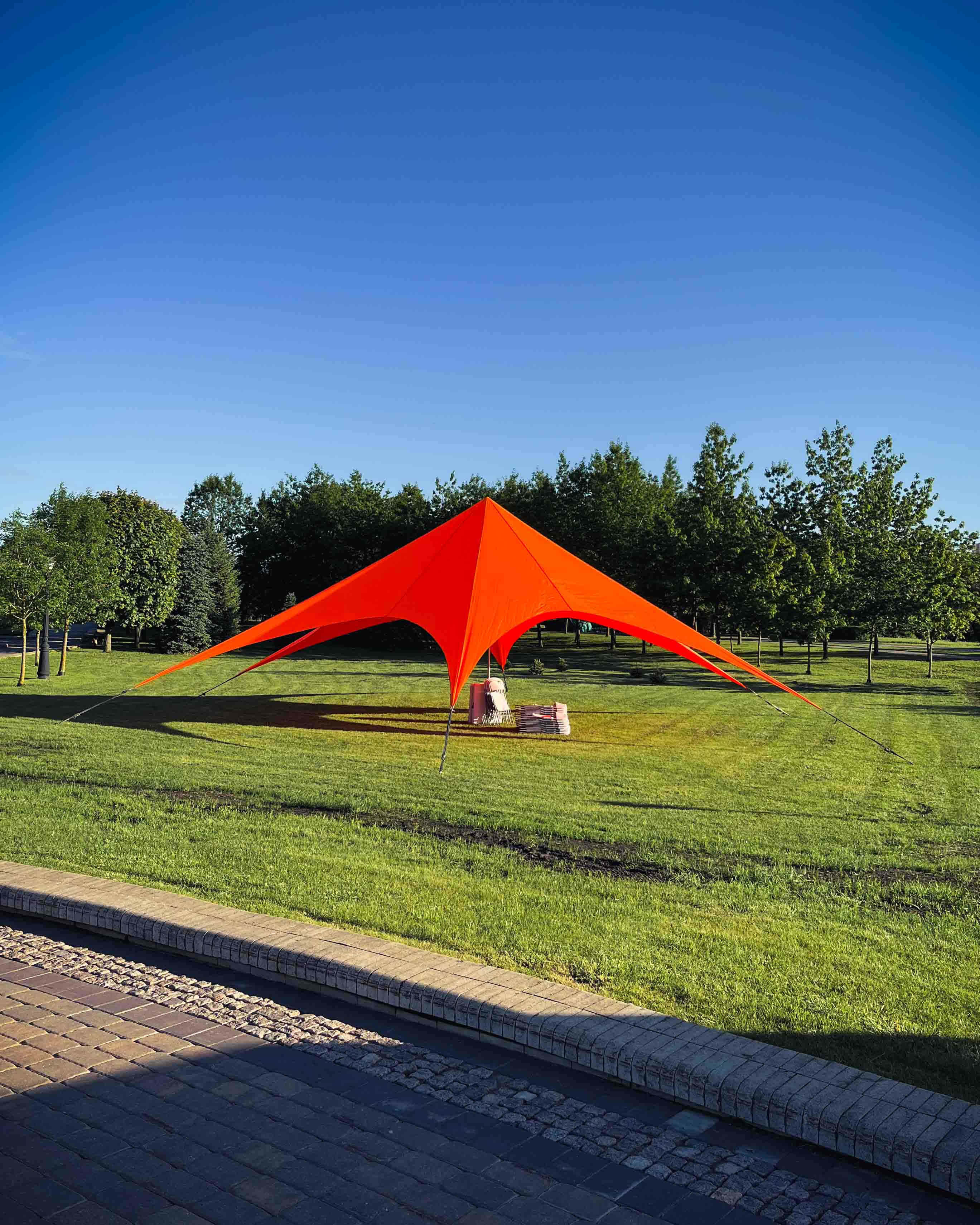 Оранжевый шатер "Звезда" площадью 75 м² станет идеальным решением для любых мероприятий, начиная от ярмарок и туристических следов, заканчивая празднованием дня рождения.