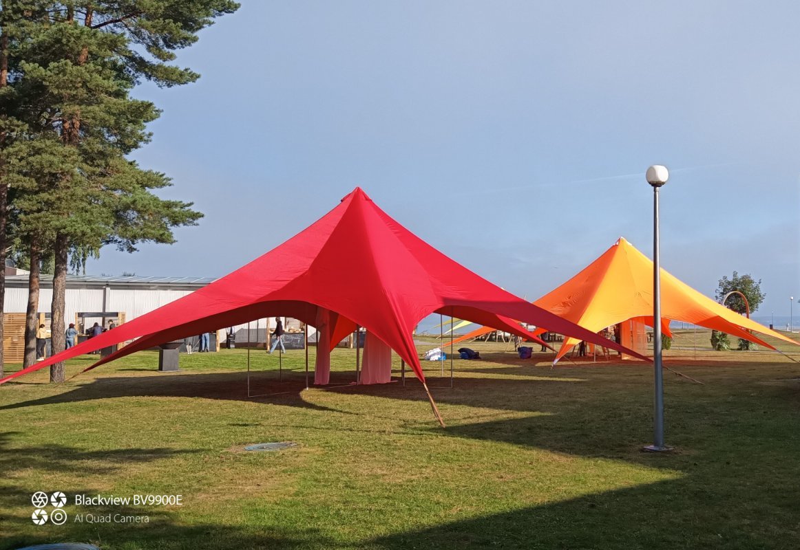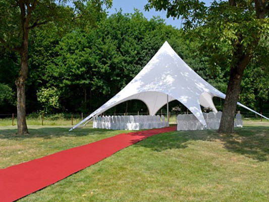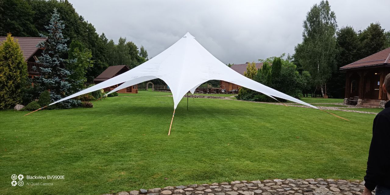 Тент-шатер «Звезда». Название шатра говорит само за себя: это яркая звезда, оригинальный выразительный дизайн, вместительный и просторный шатёр. Красивый и практичный он завоевал популярность при проведении всевозможных фестивалей, свадеб, вечеринок и корпоративов. Такие шатры активно используют при организации тур слётов, танц-площадок и кафе, устанавливают на площадках для занятия спортом, презентациях.