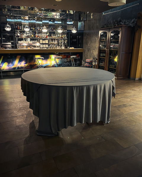 Опорная рама сварена и крепко зафиксирована шурупами к столешнице. Ножки размещены таким образом, чтобы не создавать неудобств сидящим. При аренде круглых столов для свадьбы мы также предоставим скатерти, идеально подходящие по размеру. Они красиво ложатся в складки, полностью закрывая металлическую конструкцию до самого пола.