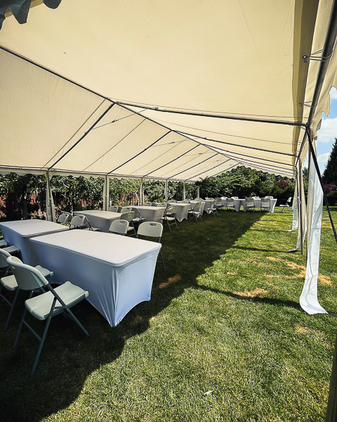 Опорная рама сварена и крепко зафиксирована шурупами к столешнице. Ножки размещены таким образом, чтобы не создавать неудобств сидящим. При аренде круглых столов для свадьбы мы также предоставим скатерти, идеально подходящие по размеру. Они красиво ложатся в складки, полностью закрывая металлическую конструкцию до самого пола.