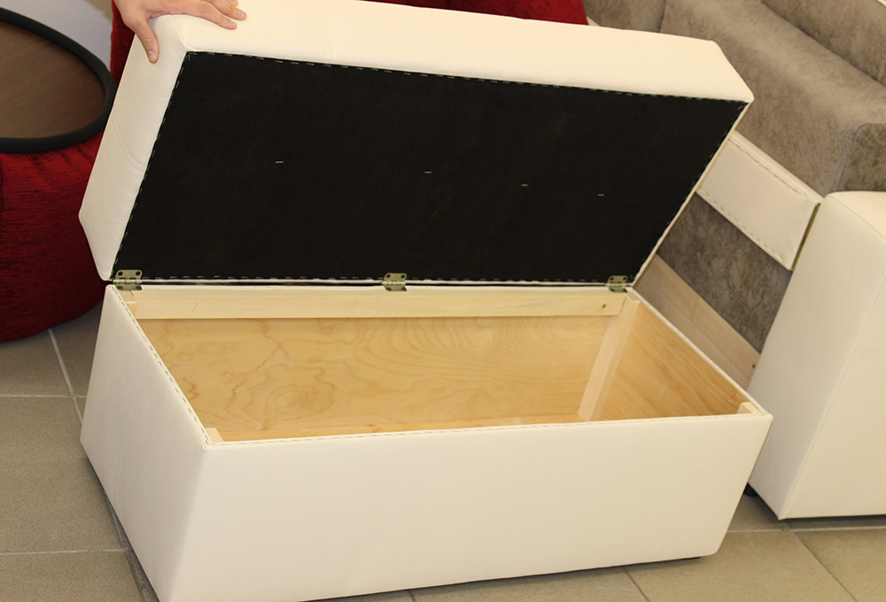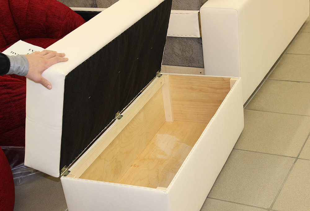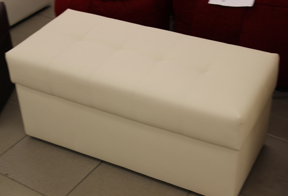 Представленная банкетка оснащена вместительной нишей в основании конструкции. Данная модель больше напоминает сундук с мягкой крышкой, чем предмет мебели. Тем не менее, данная банкетка за счет своего внешнего вида приятно дополнит интерьер и органично украсит пространство комнаты.