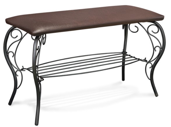 Классического вида банкетка для прихожей выполнена из металлического каркаса и обивкой из коричневого кожзама. Отлично подобранное сочетание цветов дополнит любой интерьев как в прихожей так и в иных помещениях в квартире. Изящную форму каркасу придают изогнутые металлические прутья диаметром 16 мм.