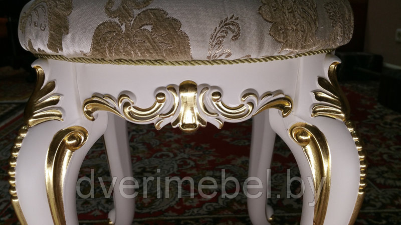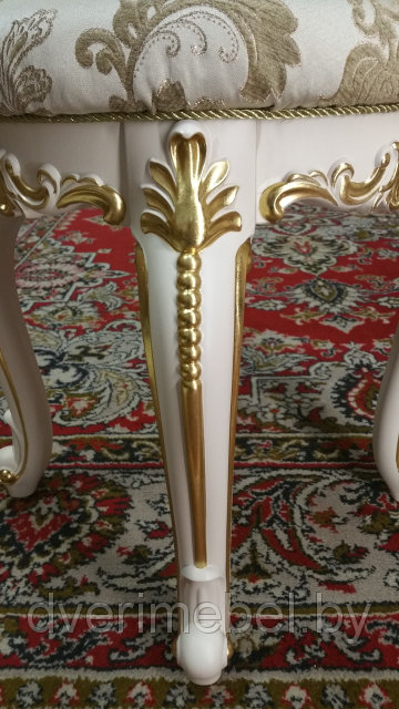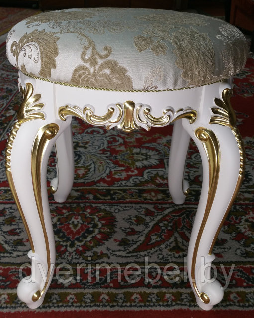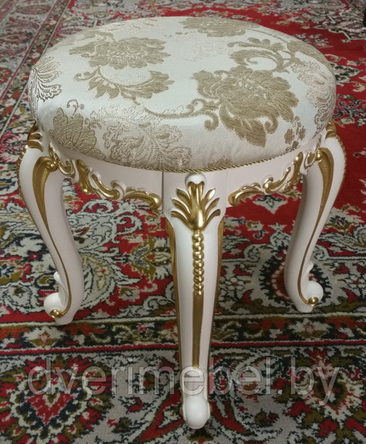 Пуфик представлен в оригинальном дизайне и декорирован позолотой. В позолоте резные элементы приобретают насыщенность и яркость, тем самым становясь изюминкой модели. Мягкая круглая подушка установлена на корпус с элегантными фигурными ножками. Доминирующий белый цвет корпуса великолепно сочетает с поталью на декоративных элементах.