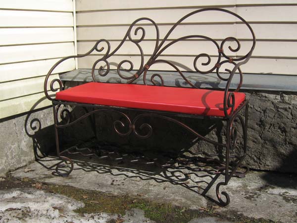 В основании скамьи лежит кованый металлический каркас, делающий модель невероятно прочной и долговечной. Сиденье имеет мягкую основу и обито влагоотталкивающим материалом, позволяющим содержать скамью в надлежащем виде.