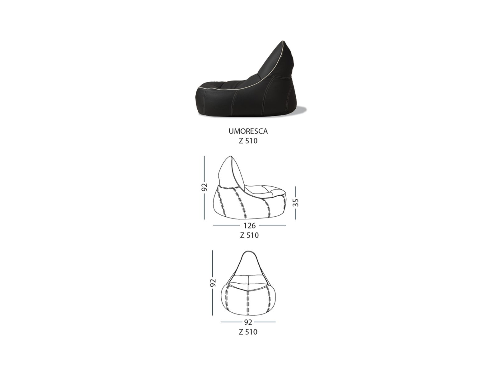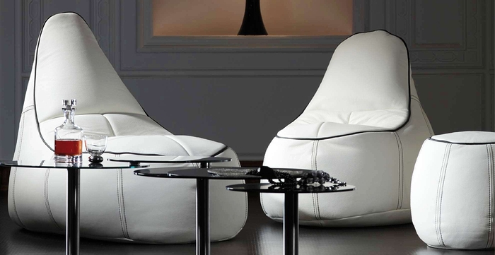 Пуфы или кресла-мешки ― это кожаные бескаркасные кресла, с наполнителем из специального материала и поролона. Очень мягкие, отлично принимают форму тела. Под весом сидящего тысячи упругих шариков очень высокой плотности упираются друг в друга и способствуют тому, что мешок отлично принимает форму тела сидящего, как бы обнимая его. Такие кресла могут иметь различные формы: пузатой бочки (Arabesque), ― или сидения со спинкой, напоминающего кресло (Burlesca), или шезлонг (Umoresca). Отделка кресел необычайно аккуратна. Швы выполнены очень точно и ― в хорошо видных местах ― подчеркнуты контрастным и необычайно декоративным кантом.