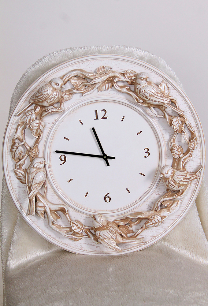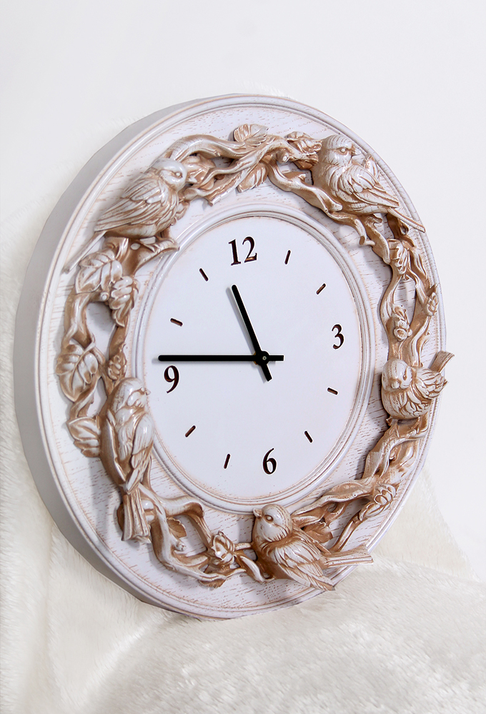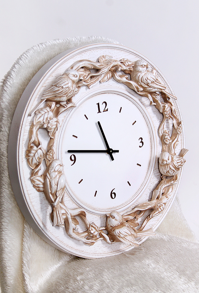 Часы «Спэроу» выполнены из массива дуба в белом цвете с элементами патинирования. Циферблат украшен резной рамкой с изображением симпатичных воробушков на ветке. Природное очарование натурального материала и реалистичное изображение птиц с легкостью украсит интерьер.