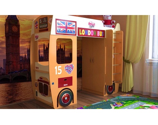 Модульная группа выполнена в виде классического лондонского автобуса. В сочетании с тематическими фотообоями создается незабываемая атмосфера. Стандартный цвет гарнитура – красный, однако присутствуют также желтые и зеленые модели. Спальное место оборудовано на втором этаже, доступ на который обеспечивается удобной лестницей. Защита ребенка от падения по сне обеспечивается надежным защитным бортиком. В составе конструкции присутствует вместительный шкаф для одежды и прочих вещей. Выбирая для ребенка данную модели кровати, вы обеспечите ему яркие впечатления и создати яркий дизайн детской комнаты.
