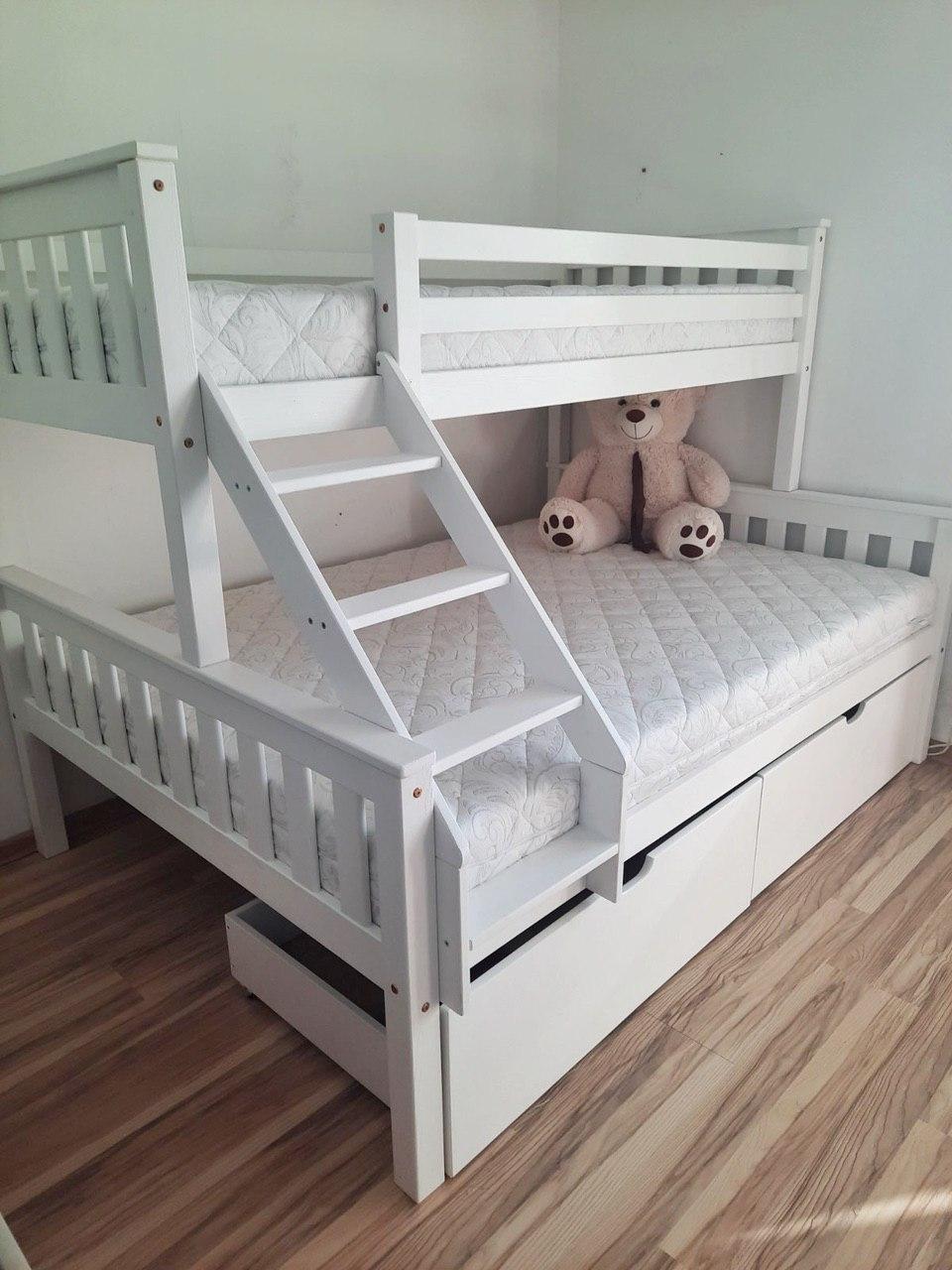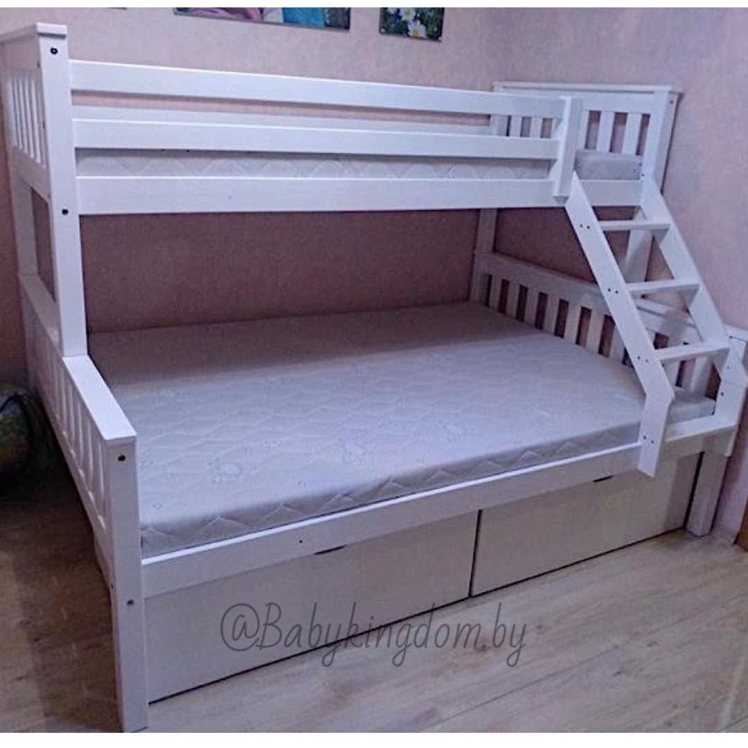 Детская двухъярусная кровать «Мальм-люкс» с выкатными ящиками изготовлена из массива сосны и оформлена в белом цвете. Благодаря большим габаритам кроватка способна разместить троих детей. Безопасная и удобная лестница позволит без труда забраться на второй ярус.