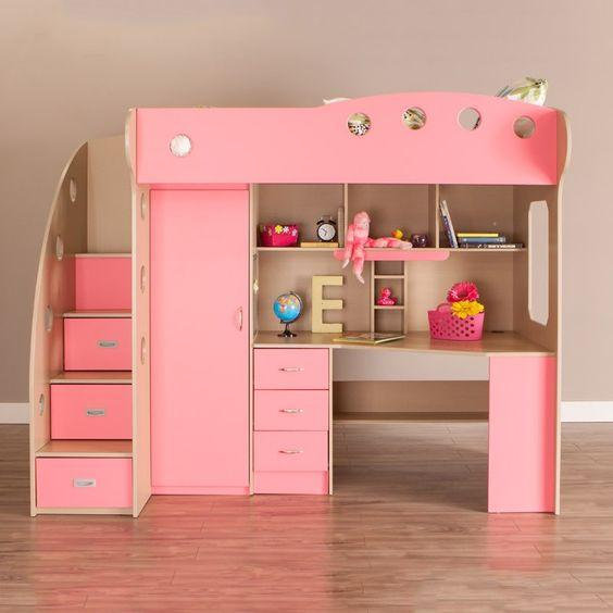 код 100879Кровать-чердак в розовом цвете. Рабочее пространство с открытыми полками.
