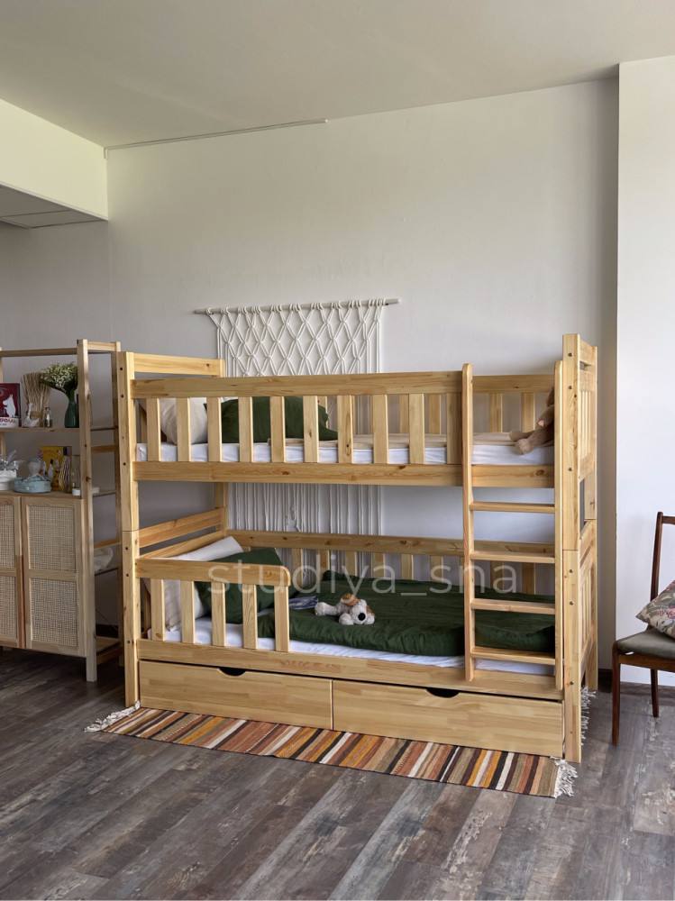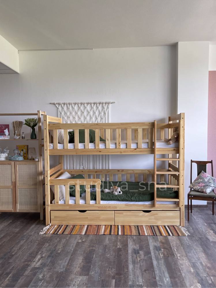 Разборная на две односпальные кровати. Изготовлена из массива сосны.
