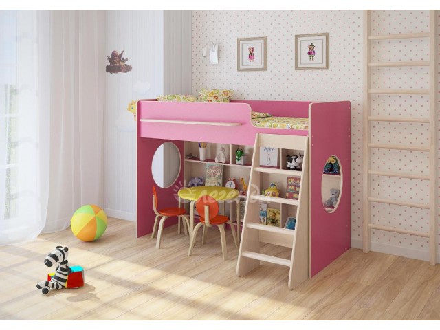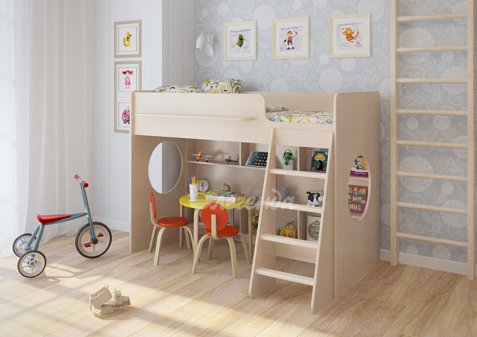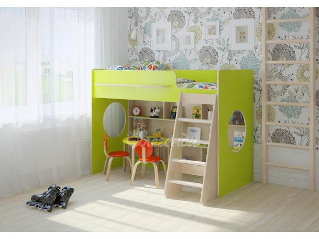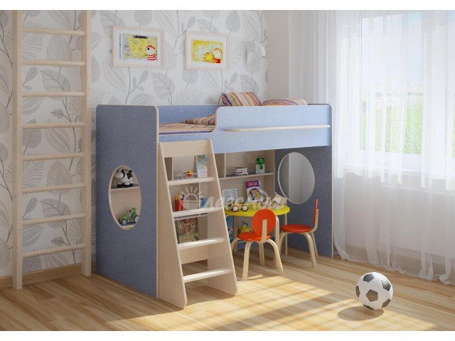 Кровать чердак со стеллажом для игрушек под спальным местом - своеобразная мини- детская комната. Надежные щитовые опоры выполнены с круглыми световыми окнами. Спальное место оборудовано высокими бортами безопасности с небольшим лазом, куда приставляется устойчивая лестница на треугольных торцах.