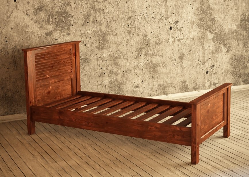 Прямоугольные спинки. Изголовье со вставкой горизонтальных жалюзи. Массивные деревянные ножки. Кровать изготовлена из экологически чистого натурального массива и тонирована под орех.