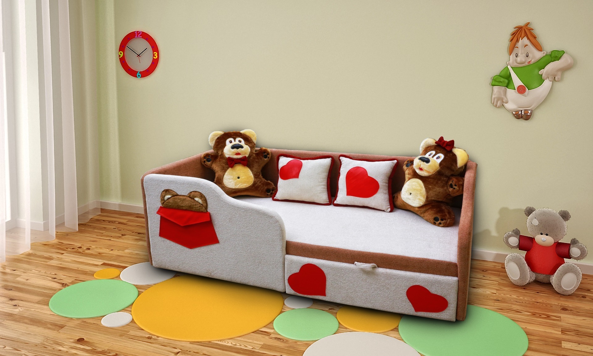 Детский диван Тед не раскладывается, но имеет выдвижной ящик для белья. Особенность его в том, что он имеет мягкие бортики, благодаря которым ребёнок защищён от падения с дивана во время сна.