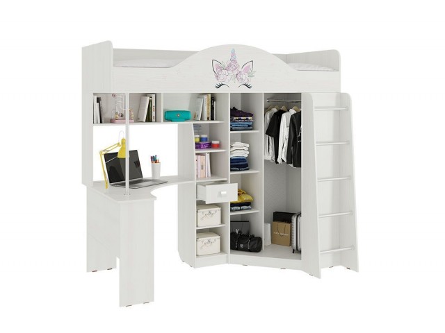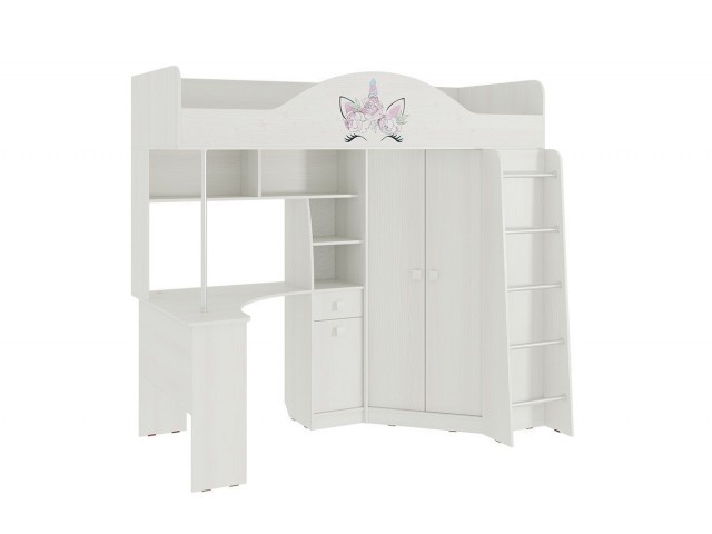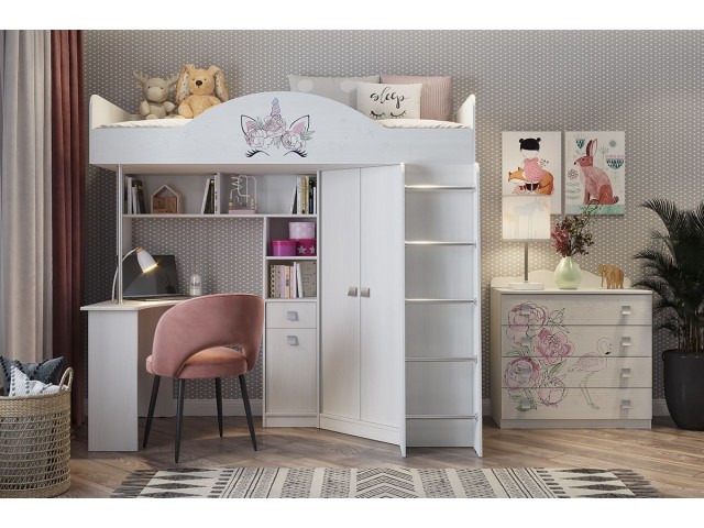 Детский комплекс Фэнтези – это не просто кровать-чердак для юной леди, а 4 в 1: в нем сочетается шкаф для одежды, рабочий стол, полки для книг и комфортное место для сна ребенка. Стильный принтерный рисунок придаст шика Вашему интерьеру.