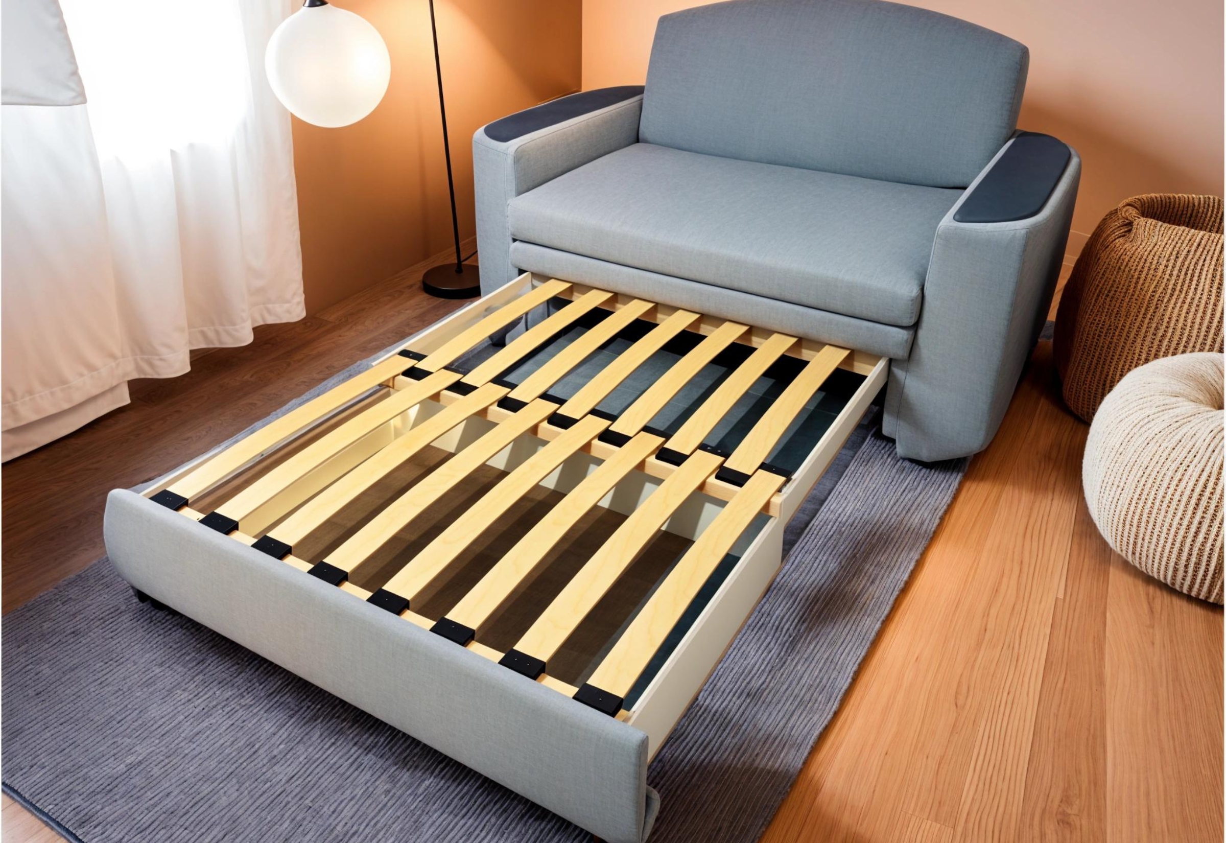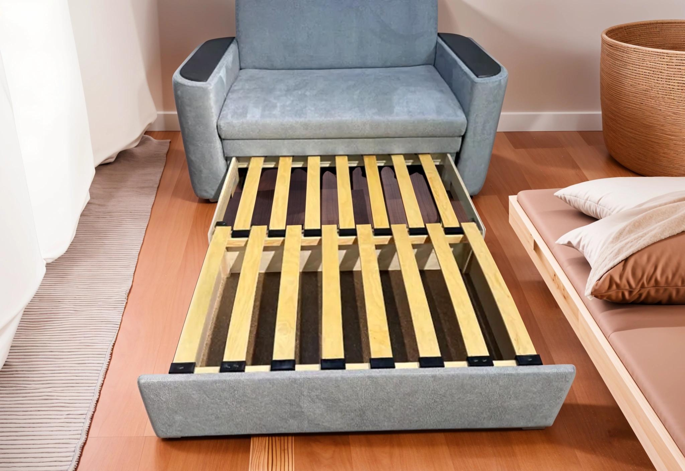 Раскладка диванов-телескопов предельно проста и не требует приложения значительных усилий. Достаточно только потянуть основание дивана на себя, после чего начнут выкатываться часть спального места, скрытые во внутренней части конструкции. Как правило, подобные модели оборудуются берёзовыми ламелями и скрытой нишей для белья.