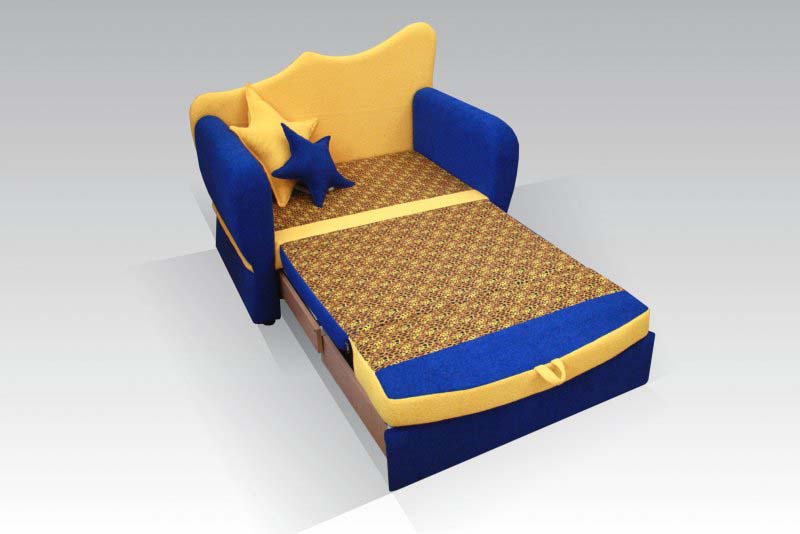 Диван-кровать «Облачко» оснащен выдвижным механизмом трансформации. Модель оборудована вместительной нишей для белья. Тематический декор выражен в синем цвете обивке, желтом облаке за спинкой и декоративными подушками в форме звезд.