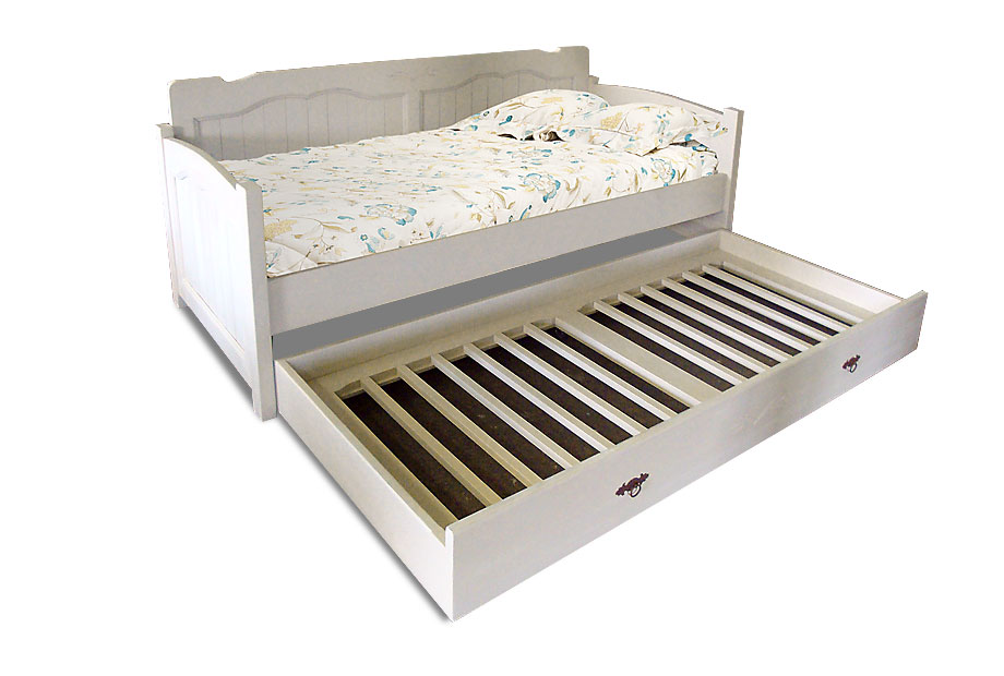 Аккуратная белая деревянная тахта для детской с дополнительным выдвижным спальным местом. Кровать имеет высокий пристенный бортик, украшенный фрезеровкой и филенками.