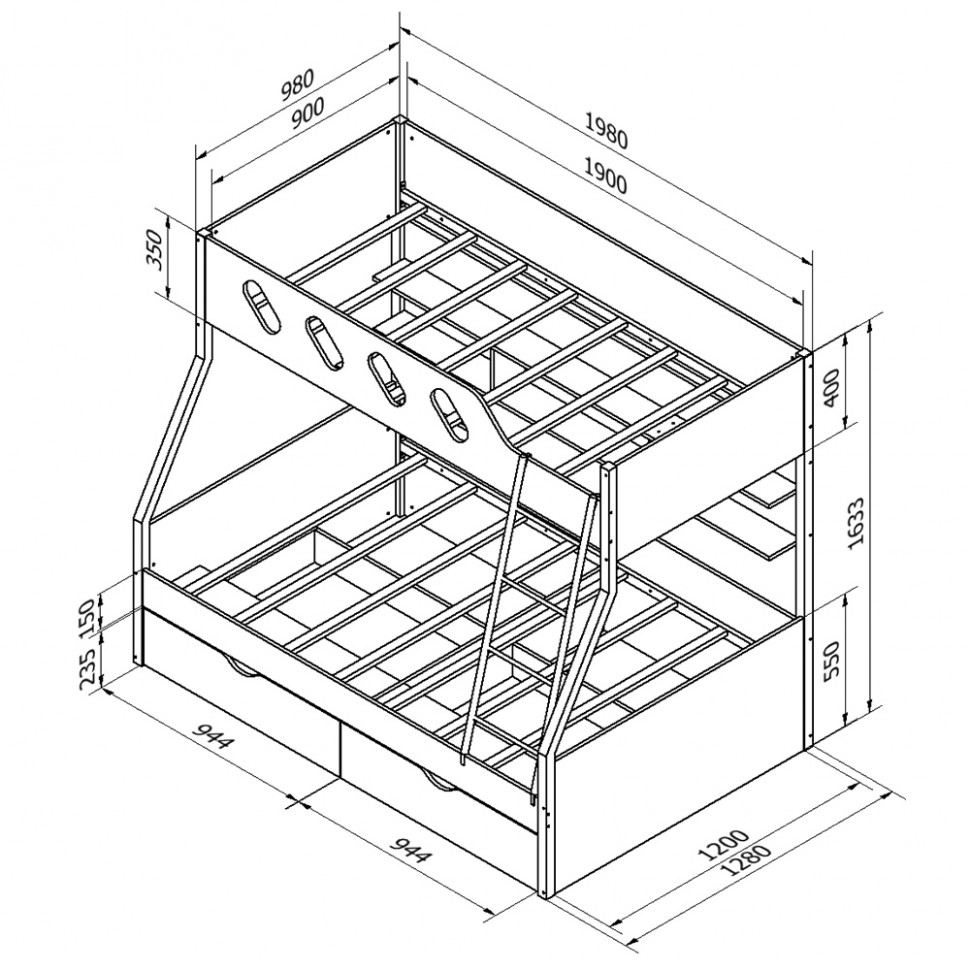 Современная и функциональная кровать дополнительным выдвижным спальным местом и ящиками для белья.
