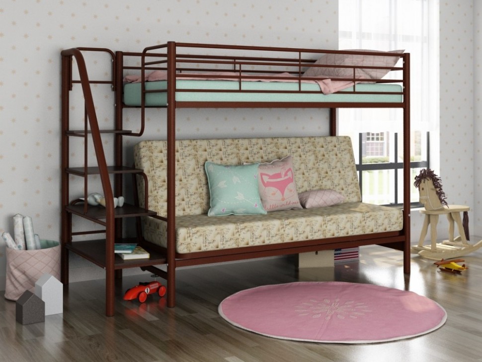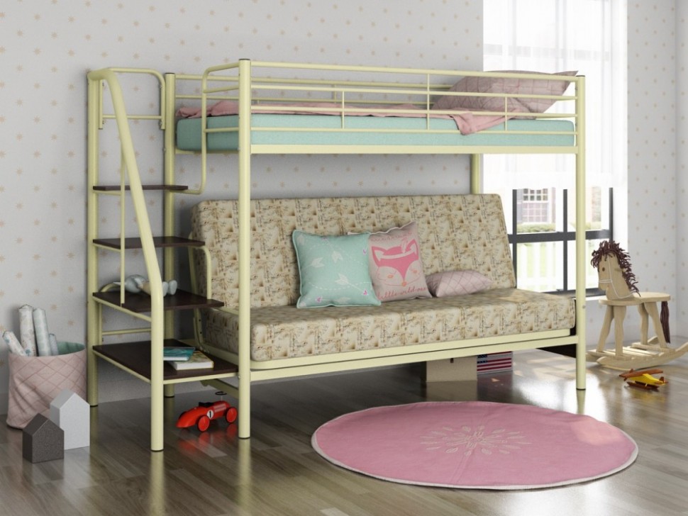 - Двухъярусная кровать Мадлен-3 может использоваться для детских комнат. А благодаря раскладному дивану на нижнем ярусе, спальное место подойдёт даже для взрослого ребёнка.