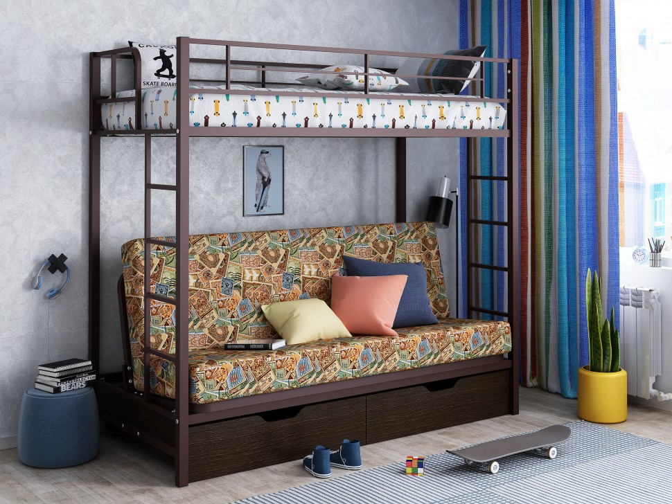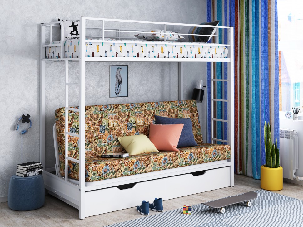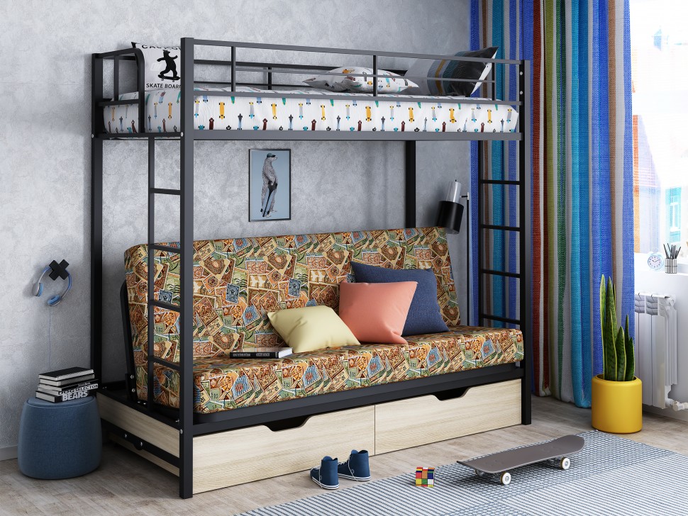- Двухъярусная кровать Мадлен с ящиками изготавливается в конфигурации с раскладным диваном. Благодаря этому вы получаете широкое раскладное спальное место внизу.