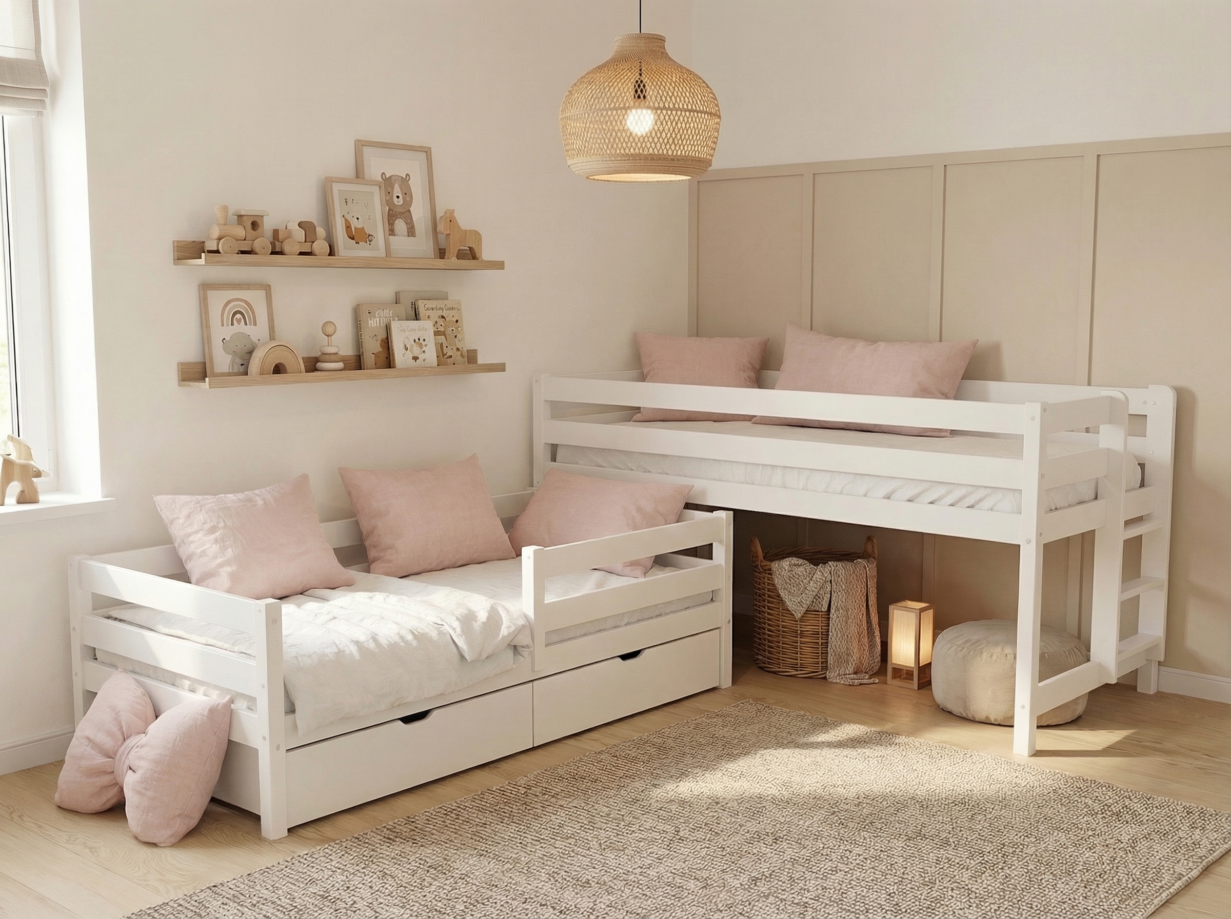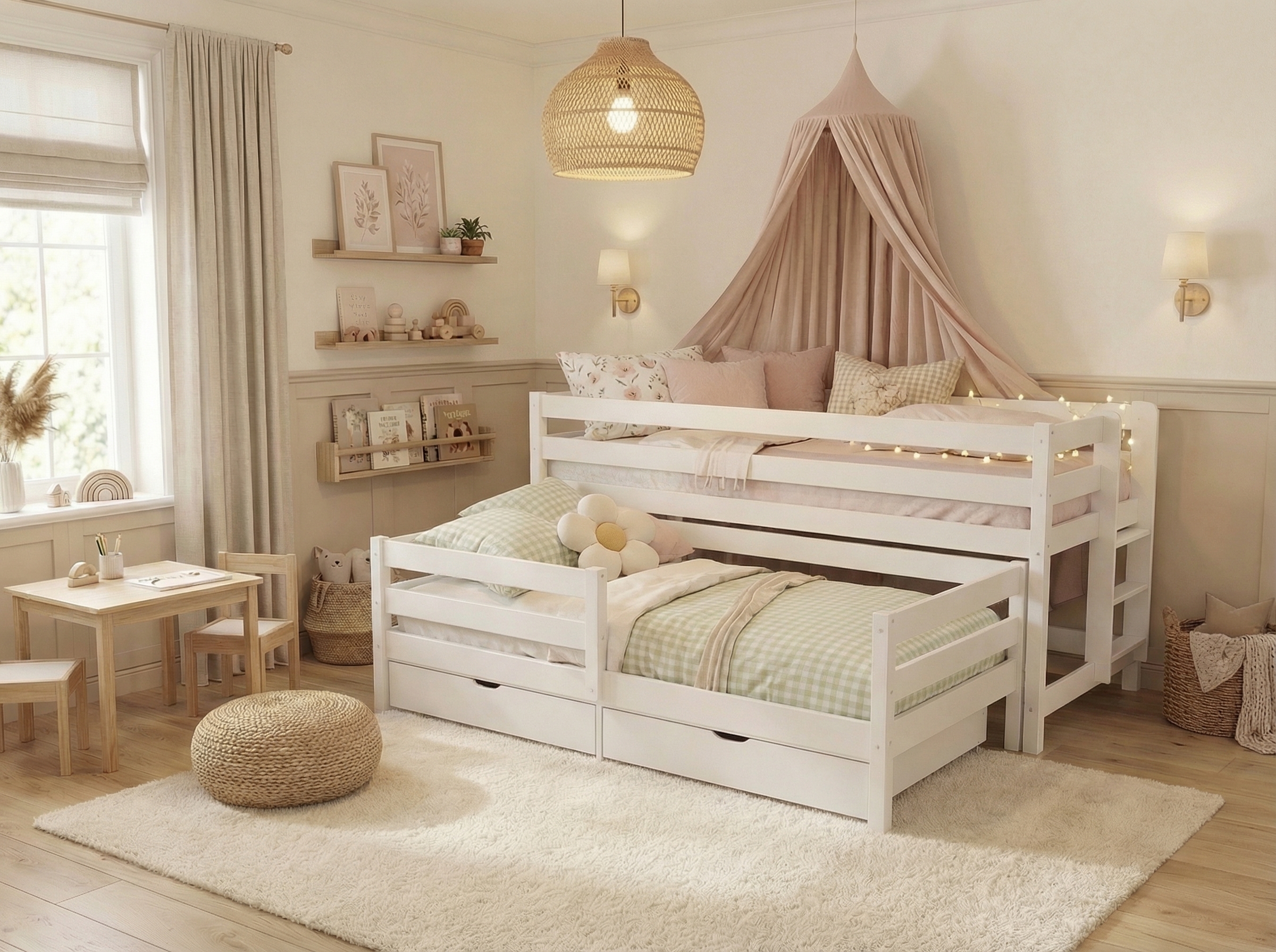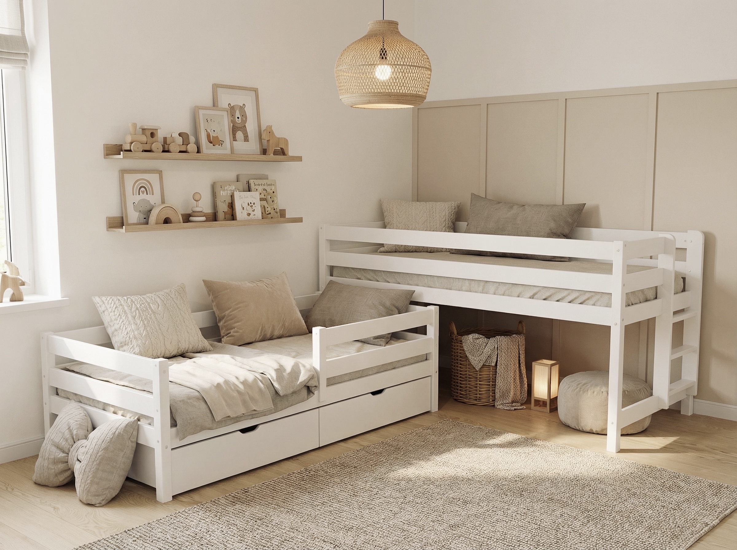 Выдвижные ящики на колесиках можно использовать не только для хранения белья, но и для игрушек, книг и других мелочей, что делает их универсальным решением для детских комнат.
