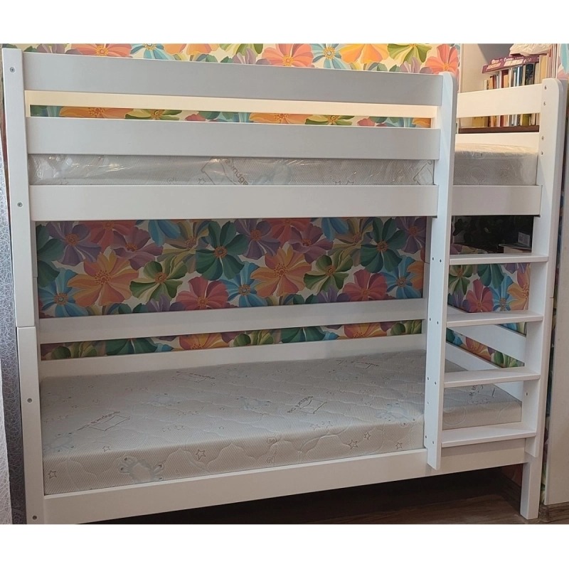 Основание состоит из гнутых ортопедических ламелей или реечного настила. Приобретая двухъярусную кровать, вы значительно экономите используемое пространство, при этом ее всегда можно разделить на 2 отдельные кровати. Лестница ставится с обеих сторон.