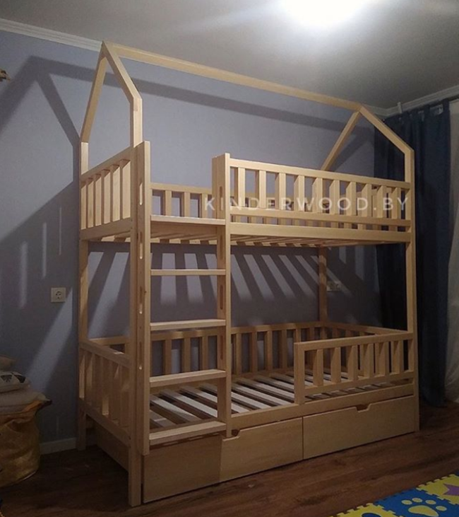 Двухъярусная кровать домик из массива сосны «Вуди-5» с ящиками