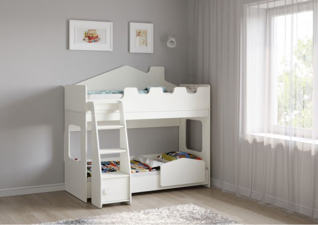 Детская двухъярусная кровать c бортиком и лестницей Альф maxi (белая)