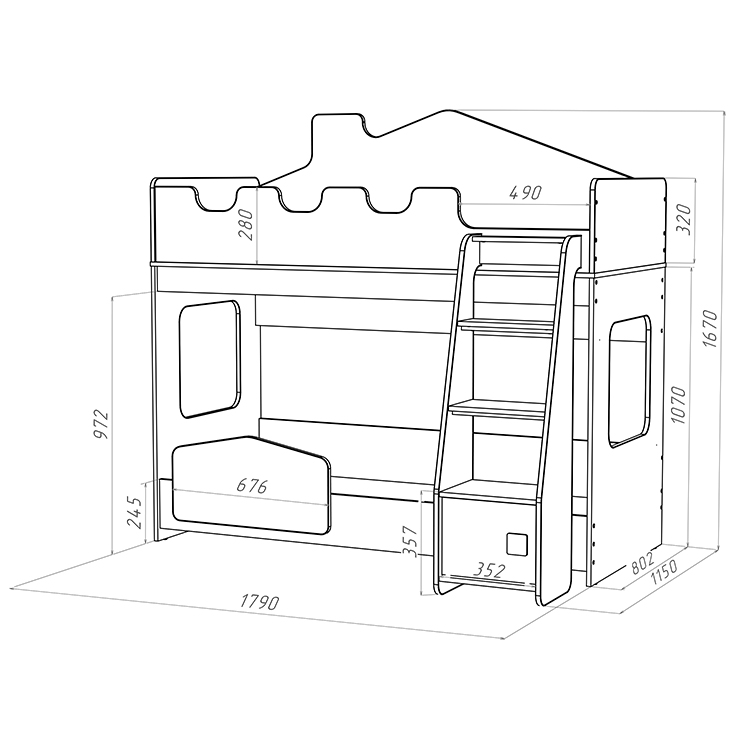 - Лестница с дверью обеспечивает удобный и безопасный подъём на второй ярус. На нижнем ярусе установлен безопасный бортик, который защищает от падений во сне. Боковые стенки со световыми окнами создают уютную атмосферу и позволяют наблюдать за звёздным небом прямо с кровати.