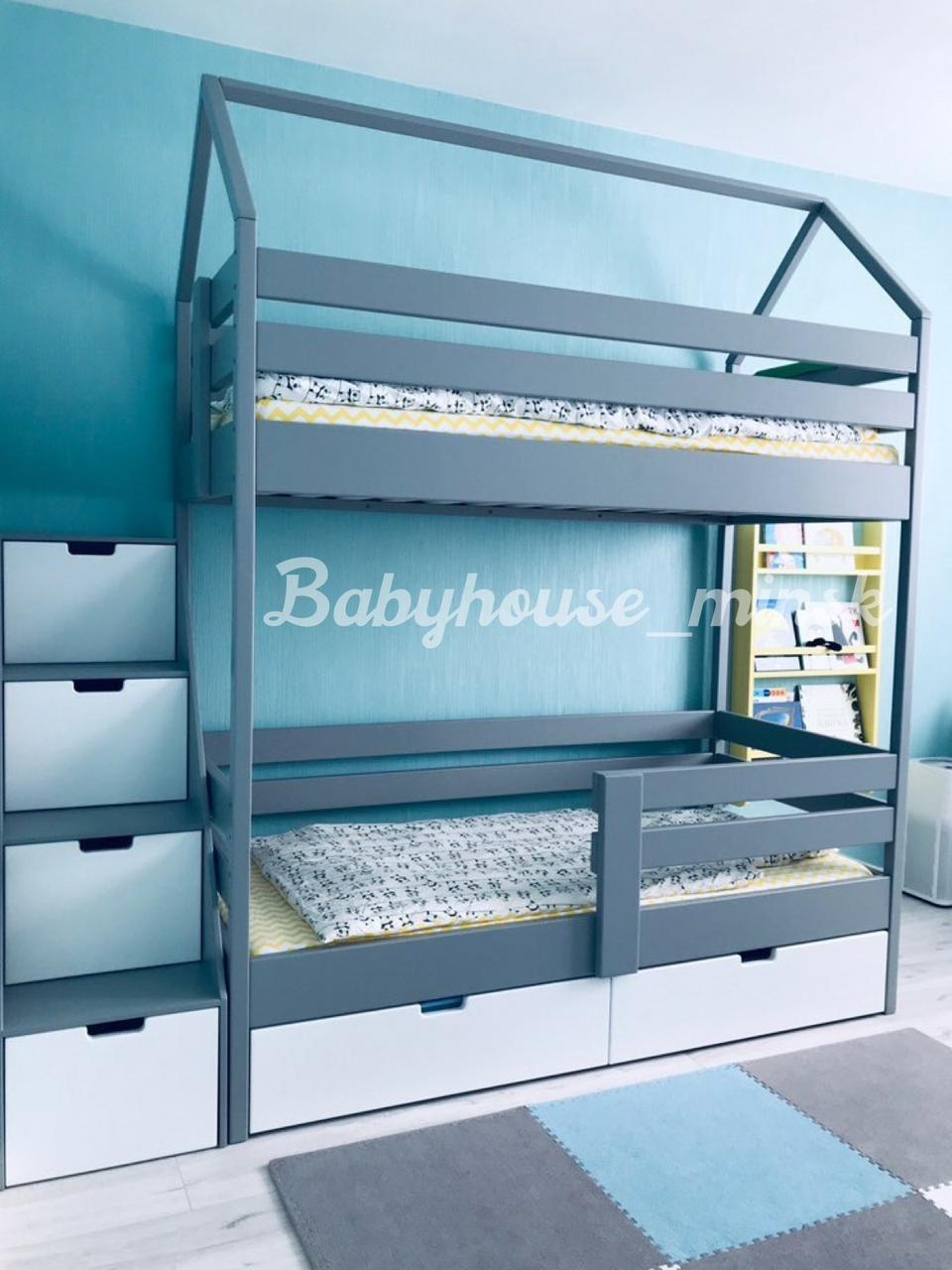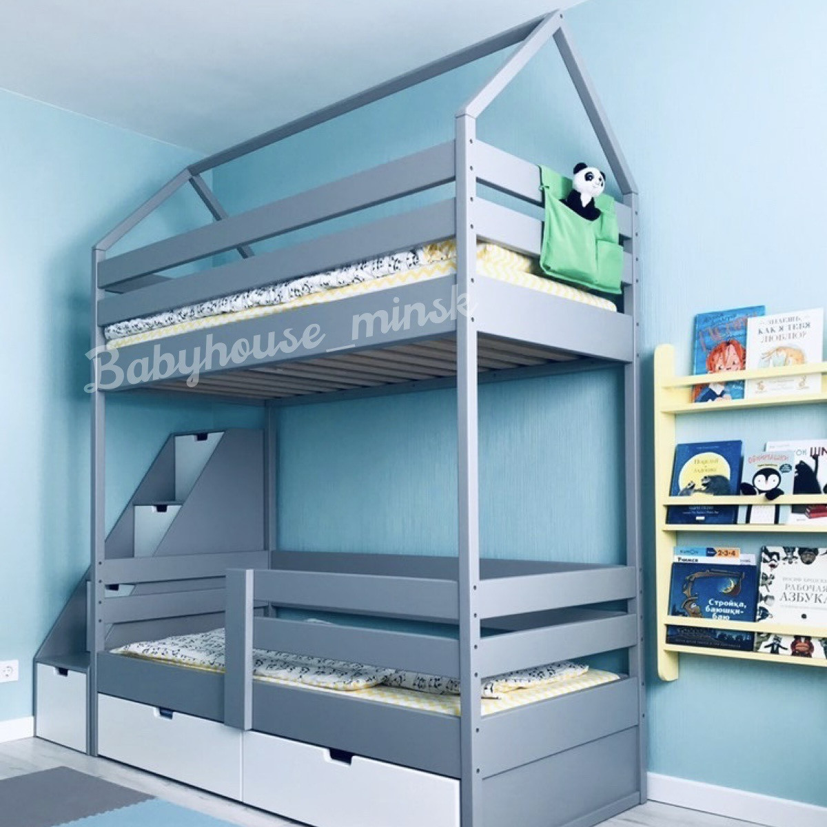 Двухъярусная кровать-домик с лестницей ступенями и с ящиками