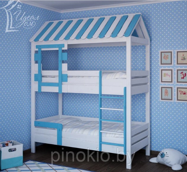 Двухъярусная кровать домик из массива сосны «Вуди-5» с ящиками