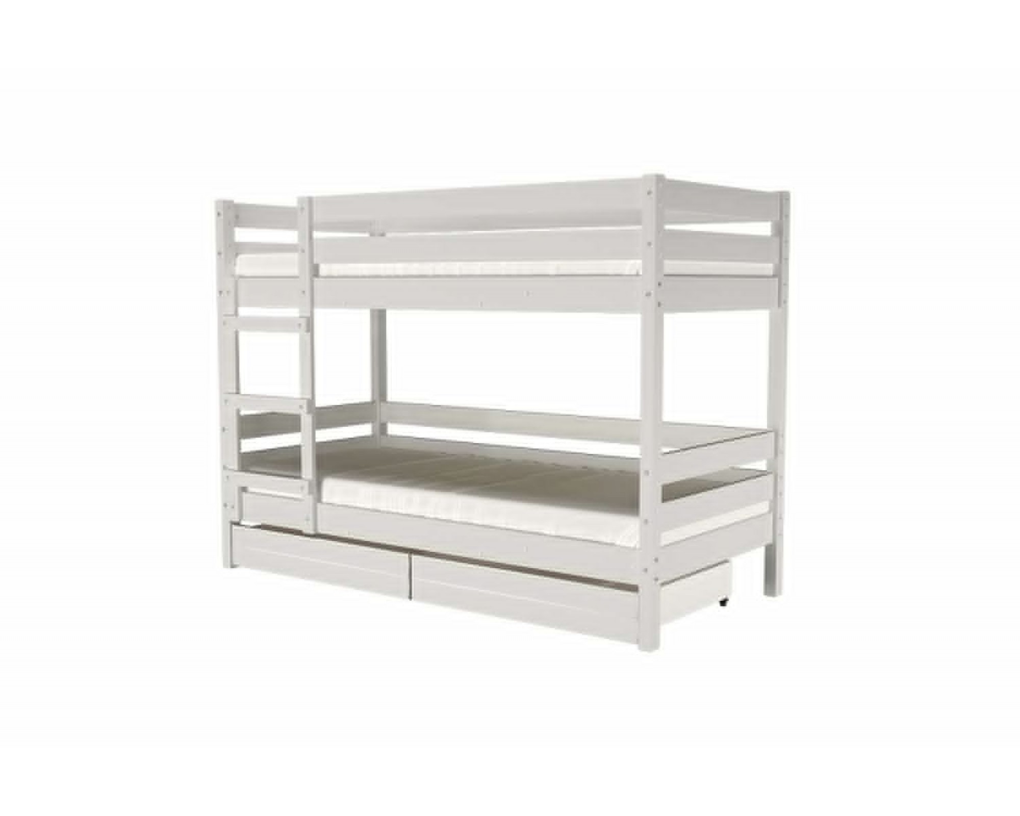Двухъярусная кровать Джуниор изготовлена из массива сосны в 5 цветах: сапфировый, антрацит, белый античный, орех и орех темный. В комплект к кровати необходимо приобрести матрас или основание с матрасом: односторонний матрас размером 90х200 см – 2 шт.; основание с ламелями и двусторонний матрас размером 90х200 см – 2 шт. Дополнительно кровать можно укомплектовать двумя выкатными ящиками для хранения вещей и игрушек. Лестницу для второго яруса возможно закрепить на любую сторону кровати.