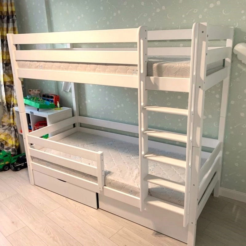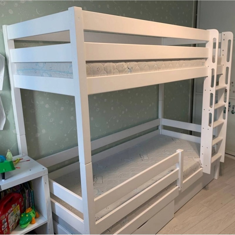 Двухъярусная кровать из массива березы «Вуди-1» с ящиками (белый)