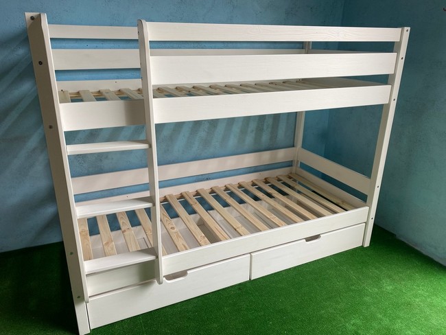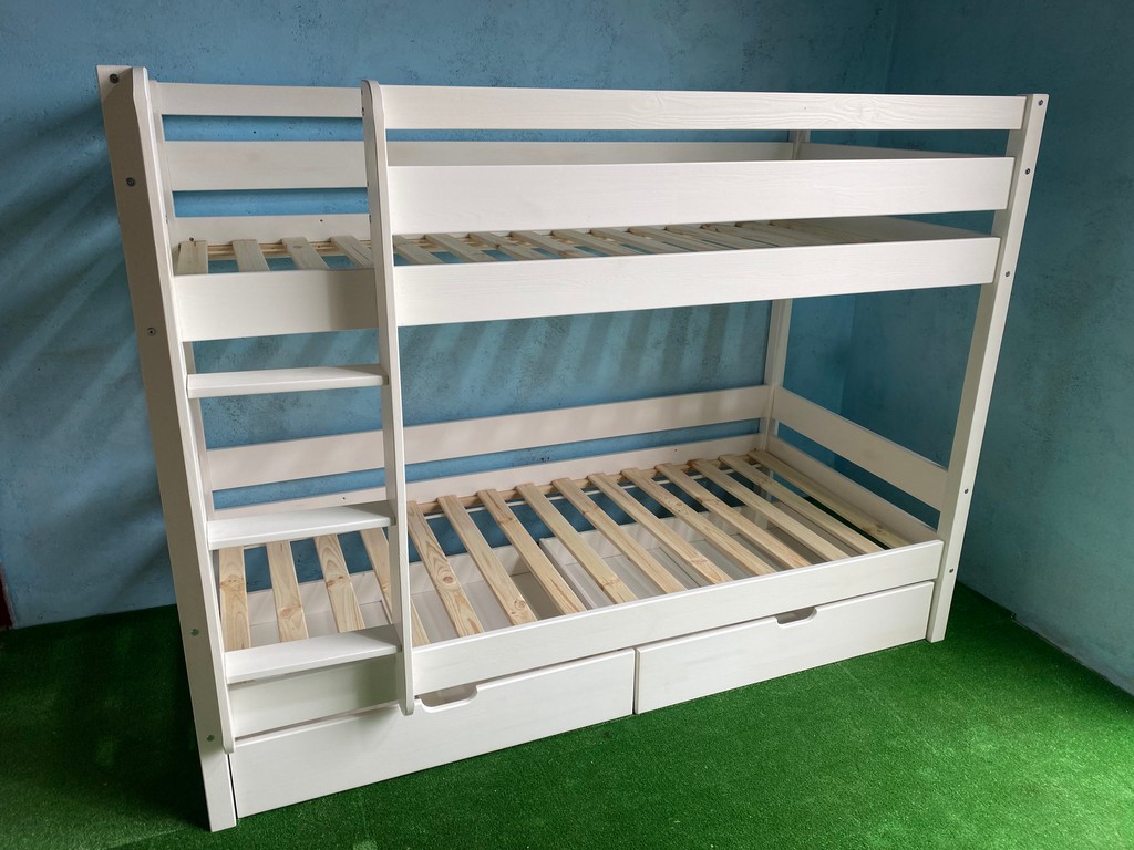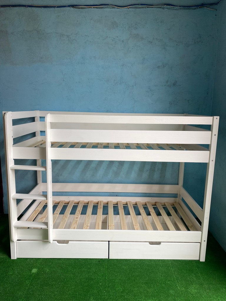 код 141985Белая двухъярусная кровать из массива с двумя ящиками для белья.