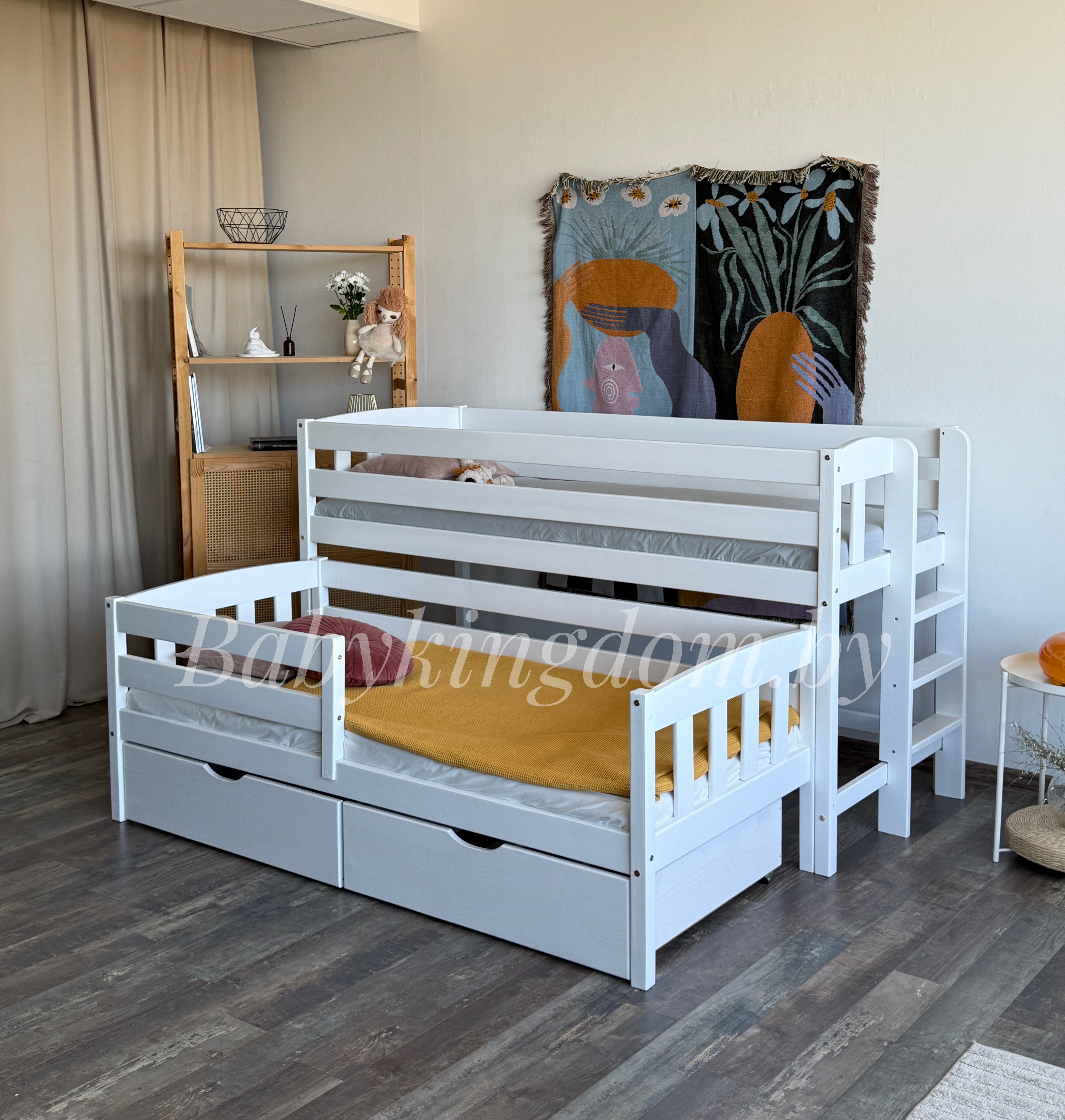 Кровать «Эрни Литтл» из массива сосны (с лесенкой и ящиками) (антик+белый)