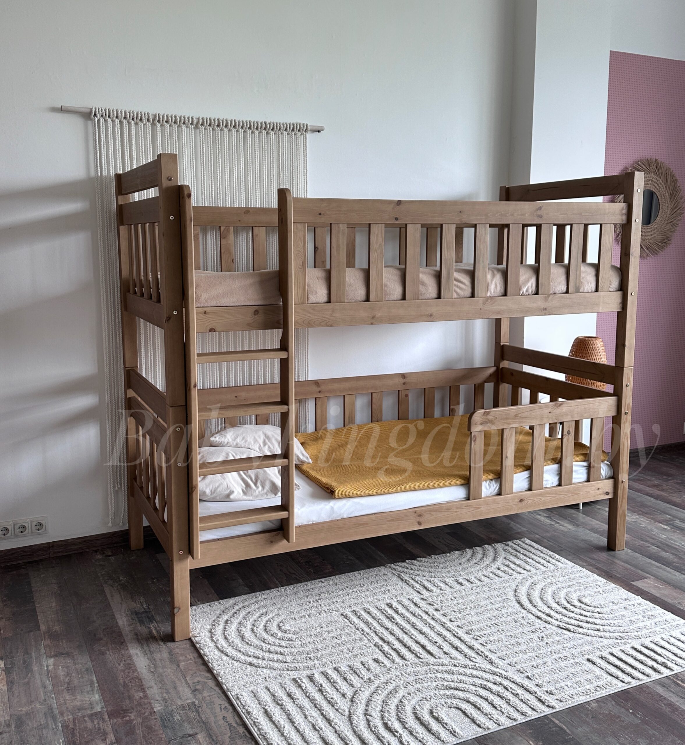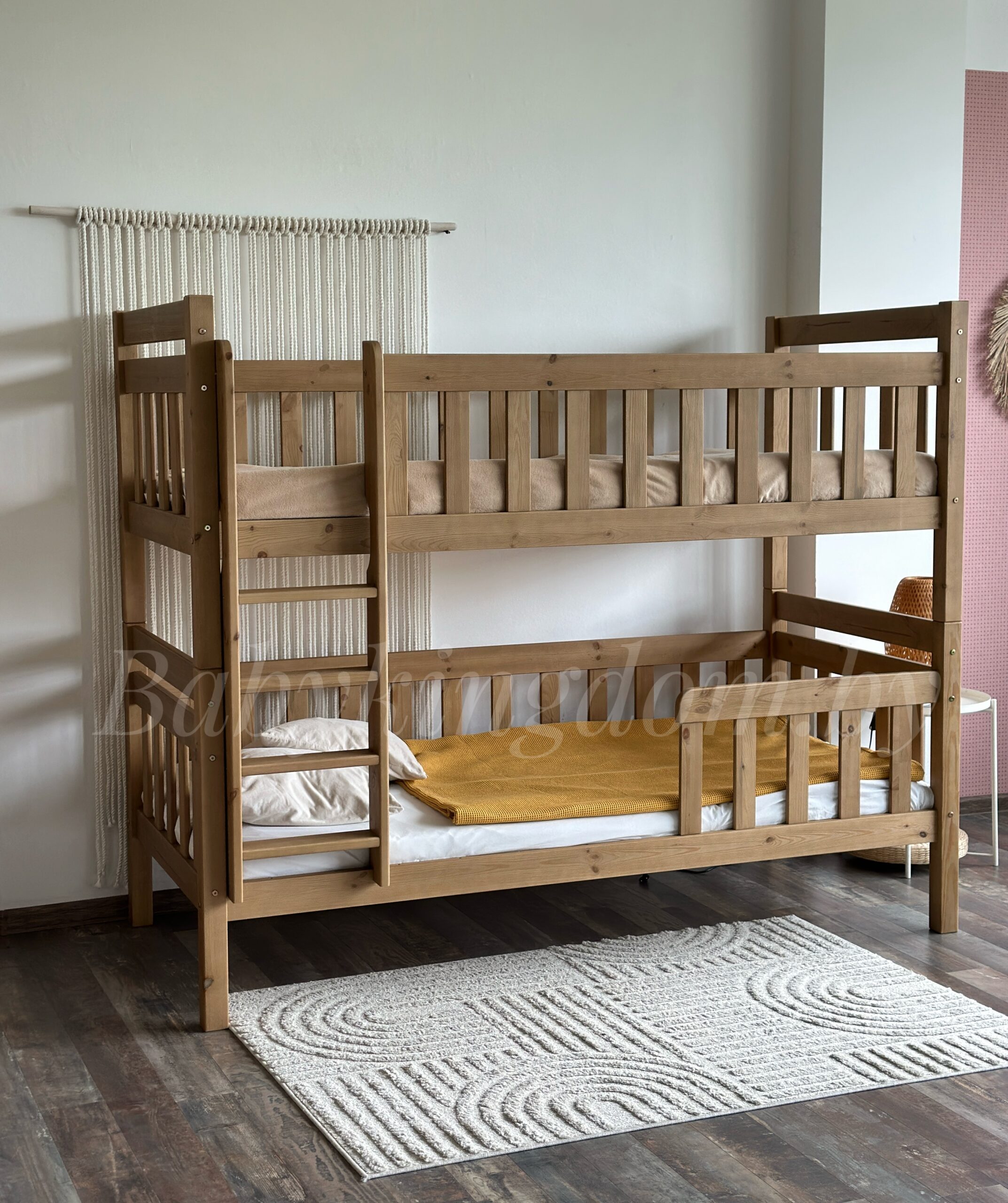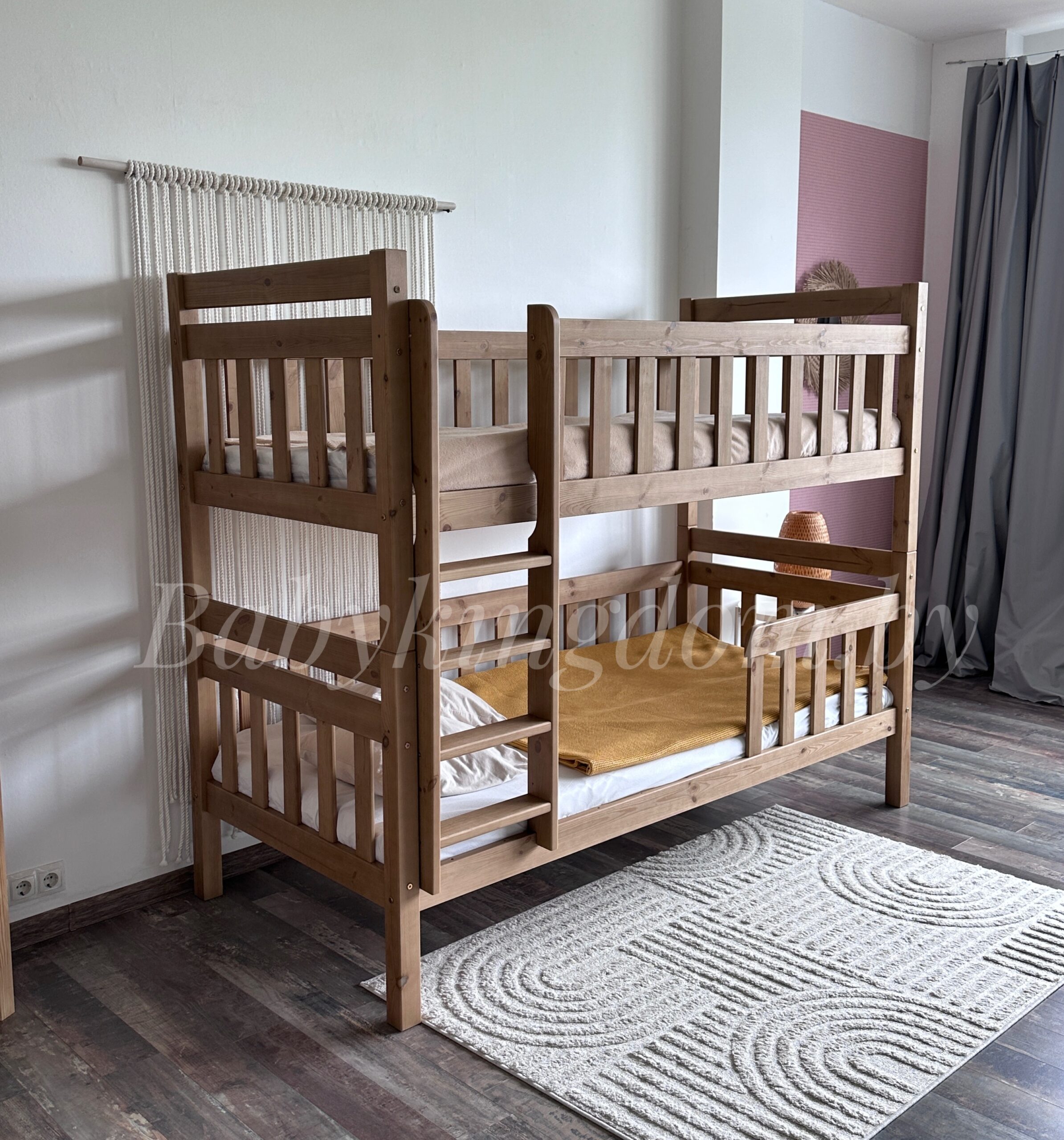 Дизайн кровати выполнен в классическом стиле, который гармонично впишется в любой интерьер. Безопасные бортики и надежная лестница обеспечивают комфорт и спокойствие для родителей, а просторные спальные места — радость для детей.