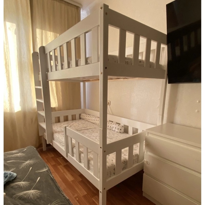 Красивая двухъярусная кровать из массива сосны - экологически чистого материала. Оснащена стационарным бортиком, который при необходимости можно снять и использовать кровать без него или переместить его на другую строно. Ограждения выполнены в виде вертикальных, высоких реек, что придает двухъярусной кровати неревзайденный види делает ее абсолютно безопасной.