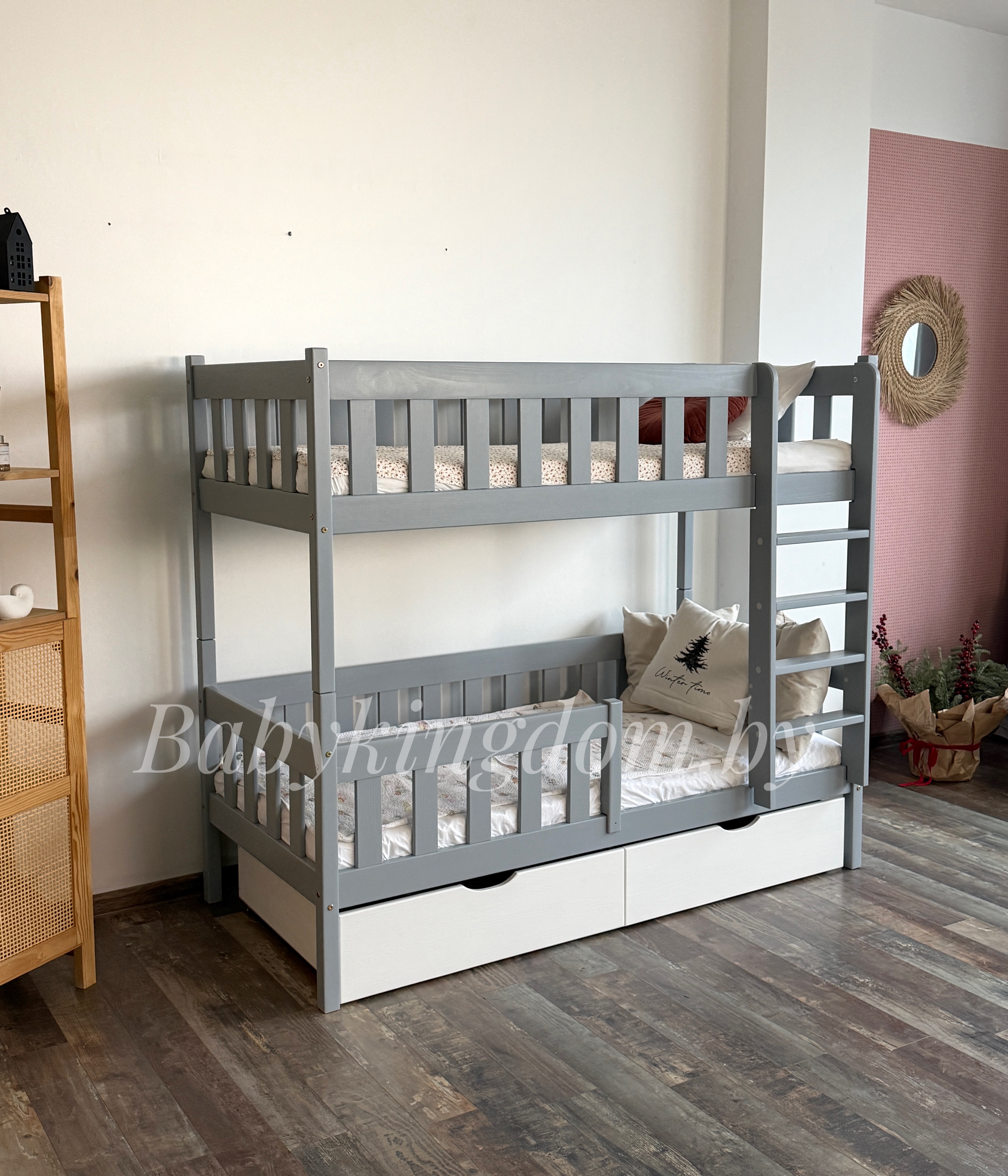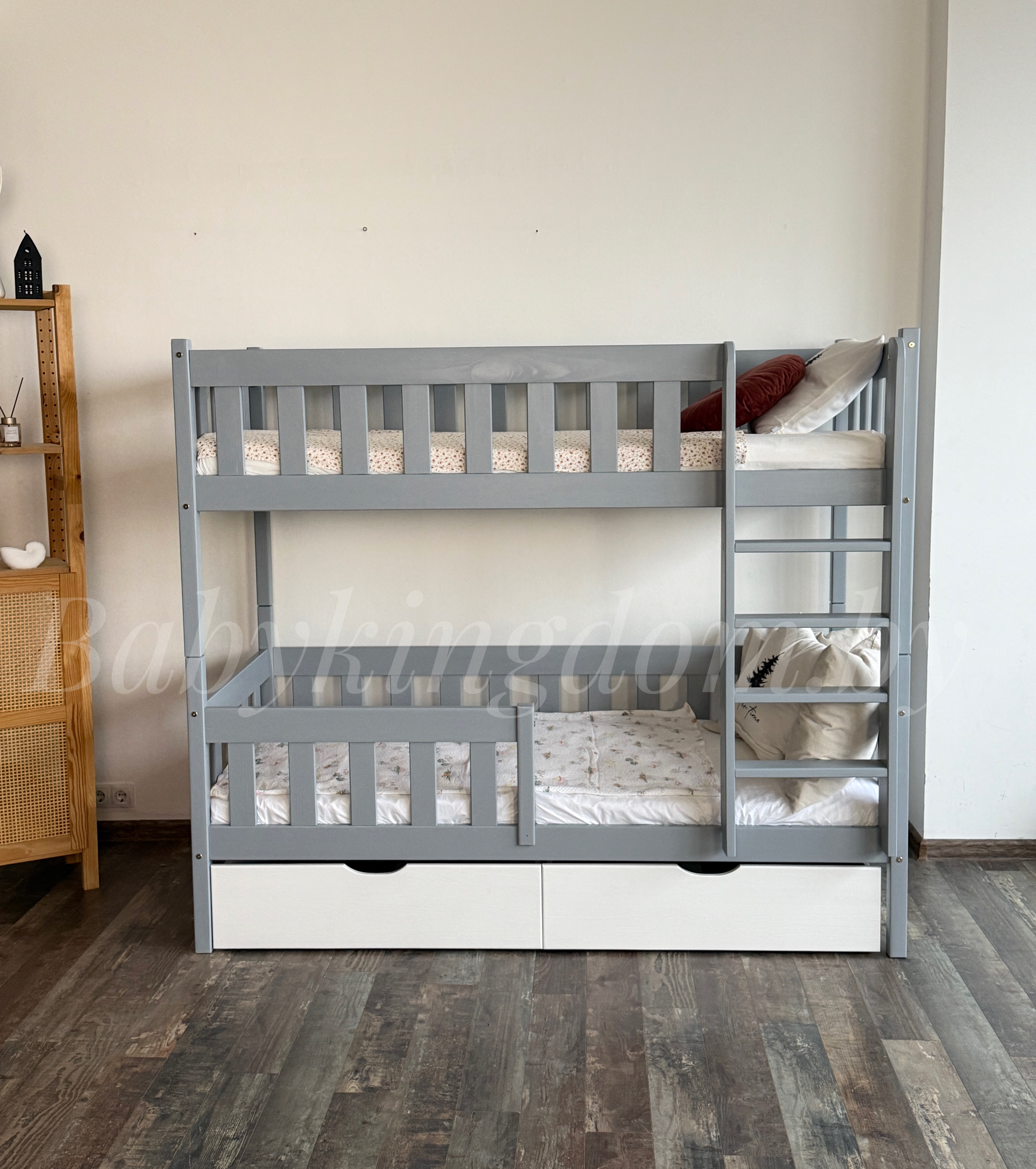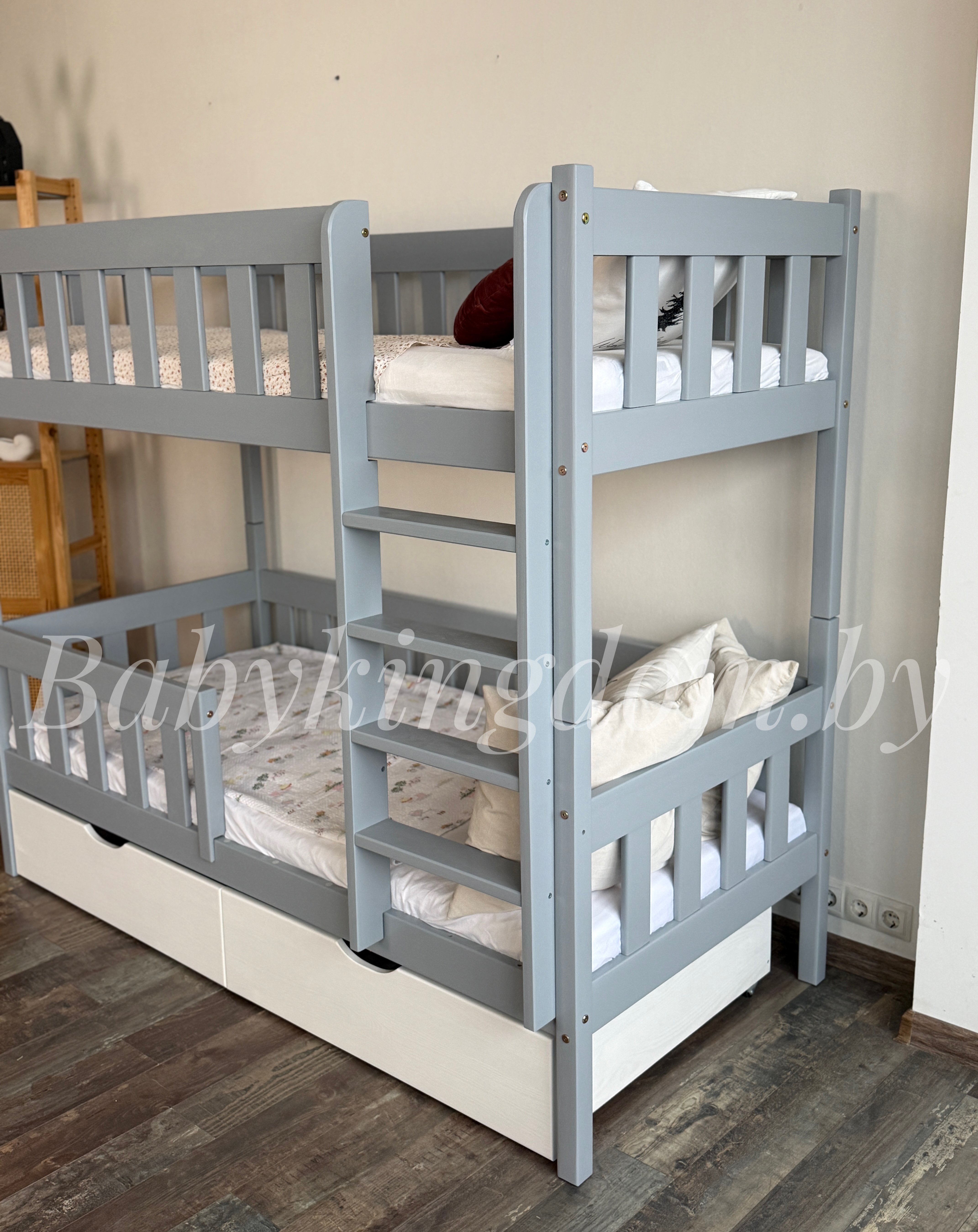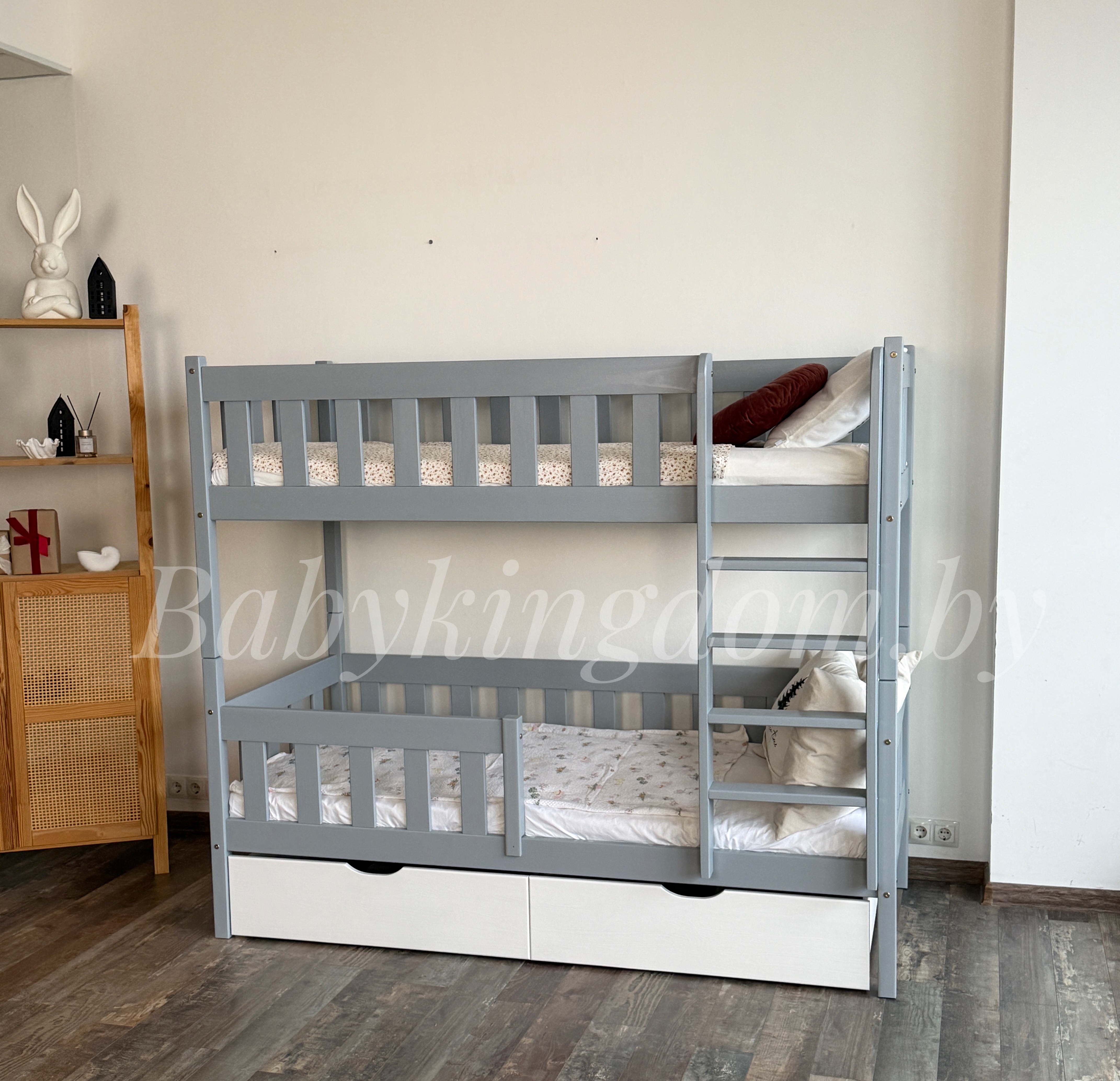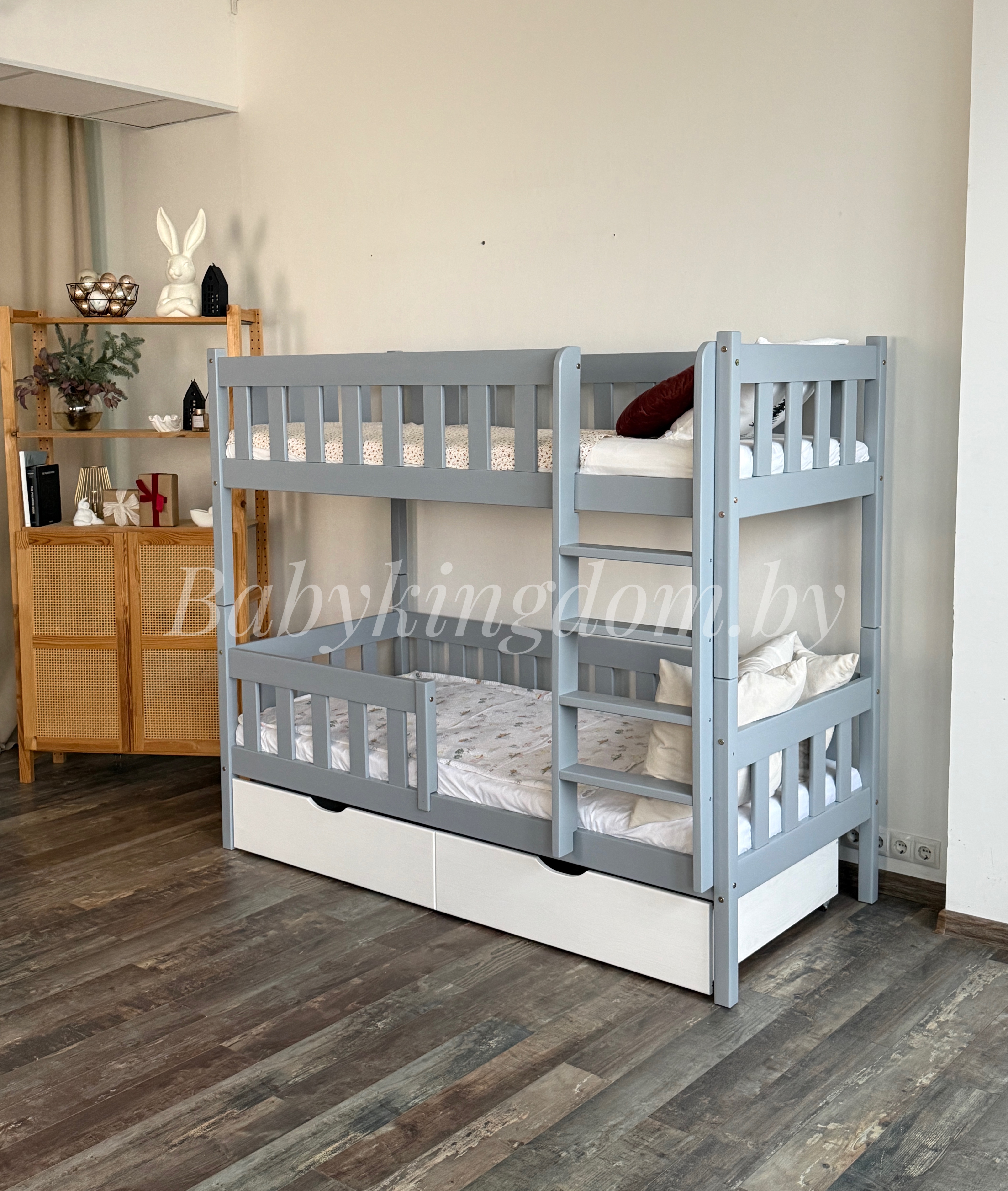 Двухъярусная кровать «Грейси» из массива сосны с ящиками (серый+белый)