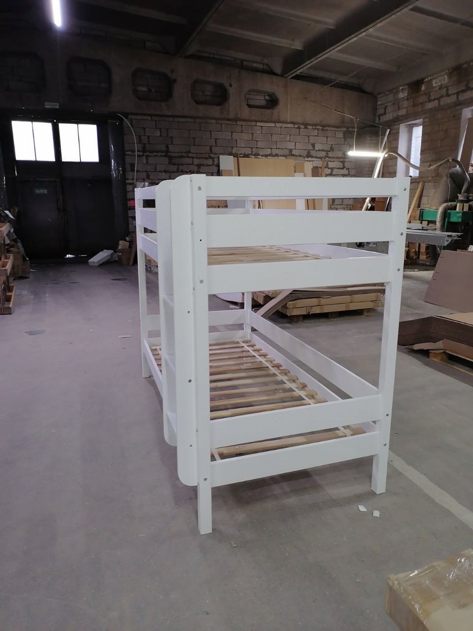 Белая двухъярусная кровать из массива с двумя ящиками для белья.