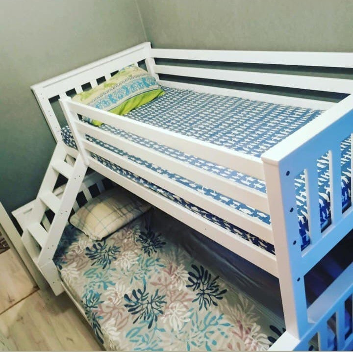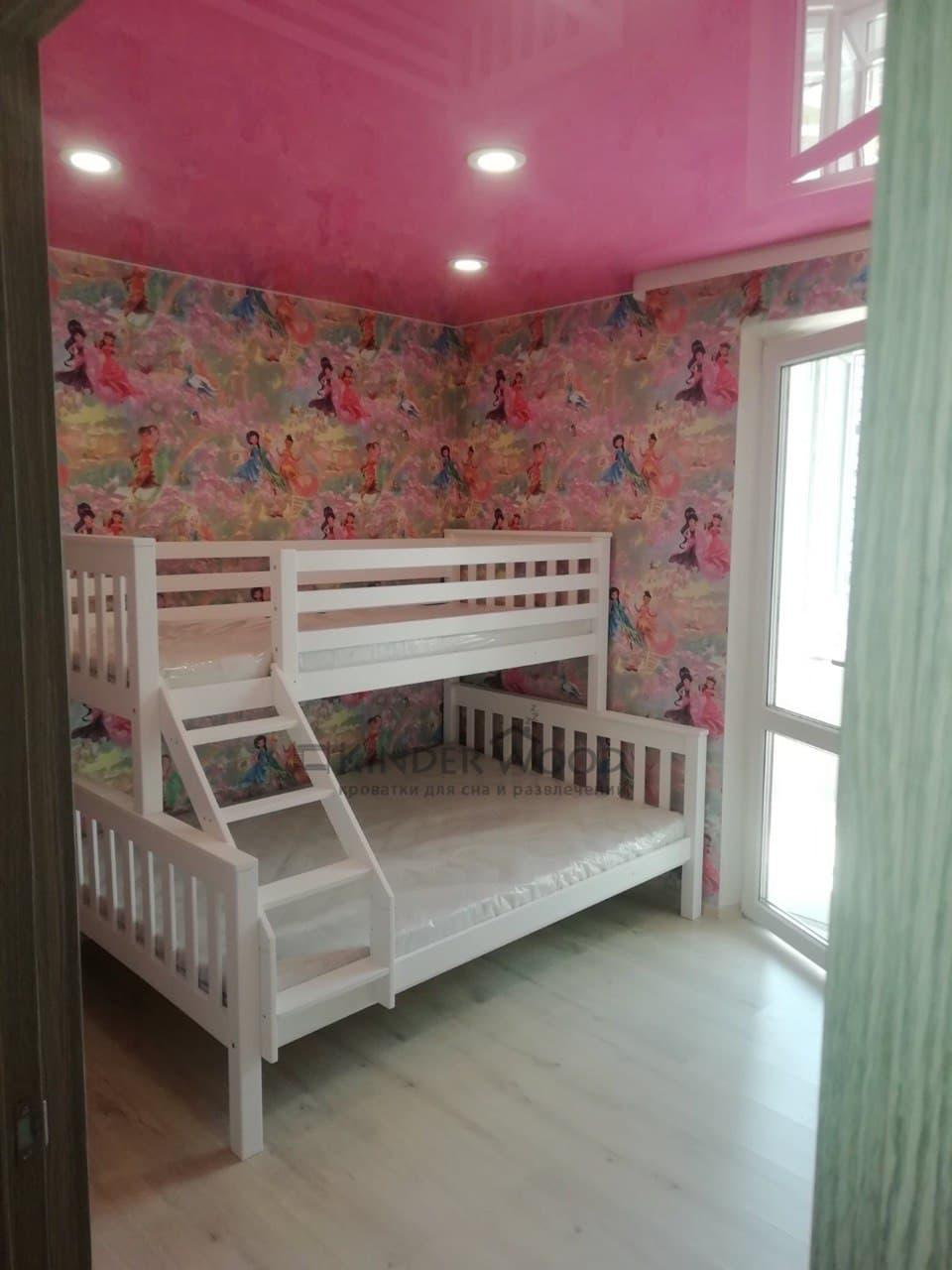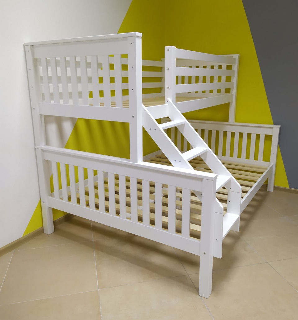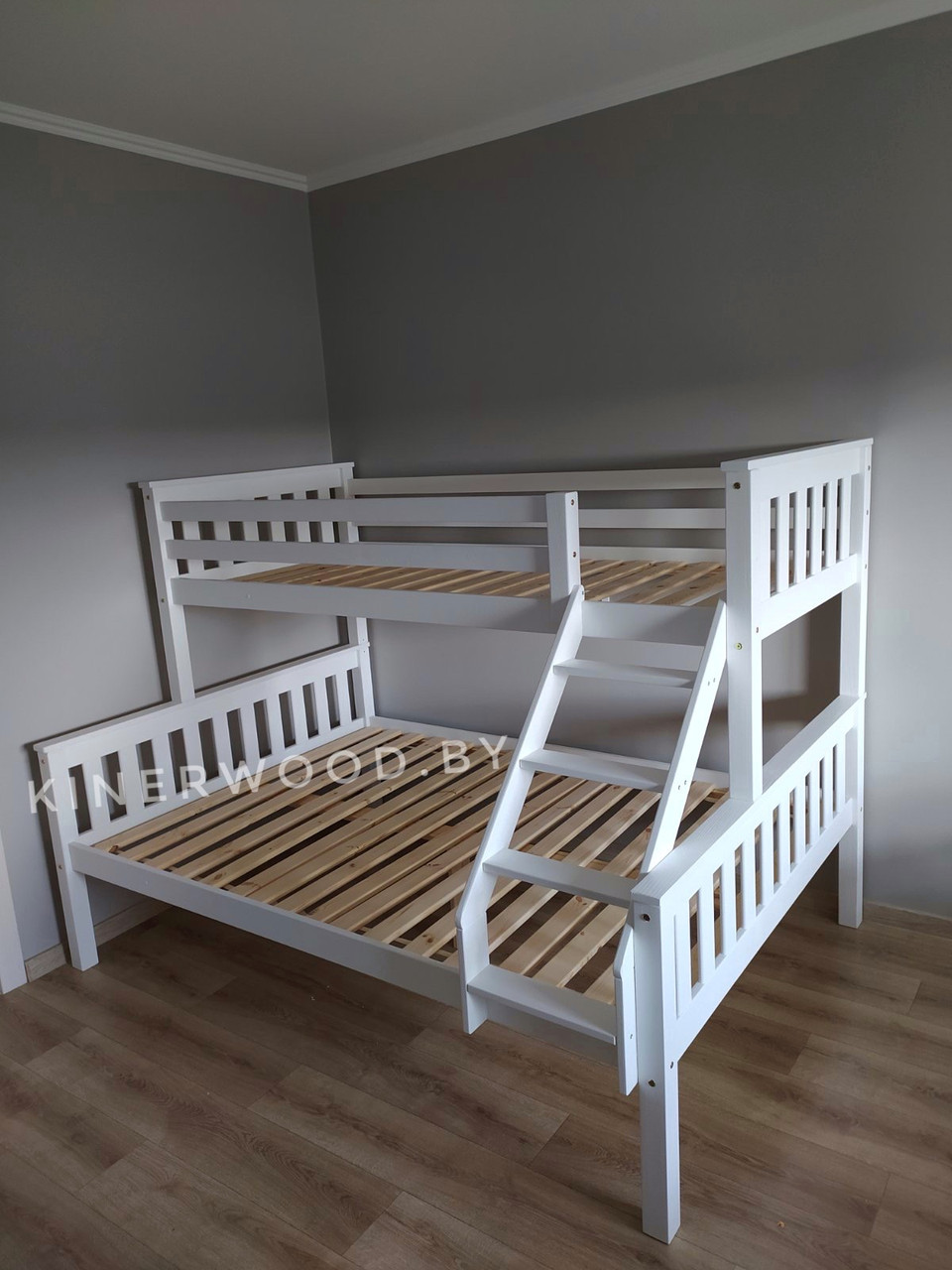 Очень интересный и необычный вариант двухъярусной кровати для детей и родителей или же для подростка и ребенка помладше. Снизу полноценная полуторная кровать , а верху односпальная. Так же можно докупить выкатные ящики под кровать для хранения вещей. Красивый и стильный дизайн плюс массив дерева придают этой кровати особый вид. Такие модели очень распространены в Европе и понятно почему, ведь это удобно, экологично и экономит место в квартире. Можно сказать вы покупаете две кровати, а занимаете площадь одно полуторной. Так же это не все п данной модели, в будущем за счет того, что кровати крепятся между собой соединительным шипом, можно снять верхнюю кровать и поставить отдельно или переместить в другую комнату. Так вы получите отдельно стоящую полуторную и односпальную кровать! Приятный бонус, не правда ли?