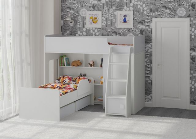 - Под верхним спальным местом располагается стеллаж,отлично подходящий для хранения игрушек.