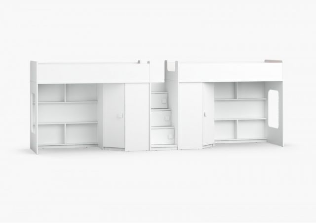 - Две кровати, два шкафа, две игровых зоны – одна лестница. Идеальный вариант для сиблингов!