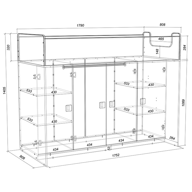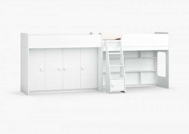 Габаритные размеры: 1790x1162x1677 мм. Два шкафа с ящиками. Стеллаж. Лестница с местом для хранения.