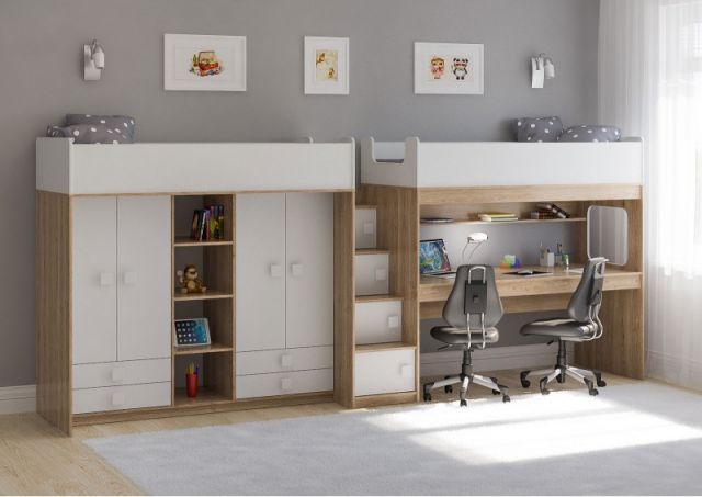 - Две кровати, два шкафа, большое рабочее место – одна лестница.