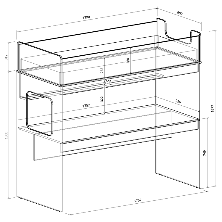 - Под спальным местом располагается рабочее место с большим столом и два шкафа с выдвижными ящиками.