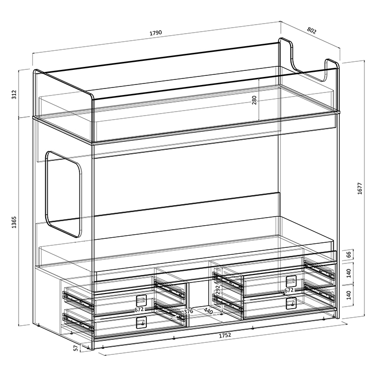 - Под нижним ярусом раполагаются 4 выдвижных ящика. Теперь у каждого ребенка есть свои места хранения вещей и игрушек.